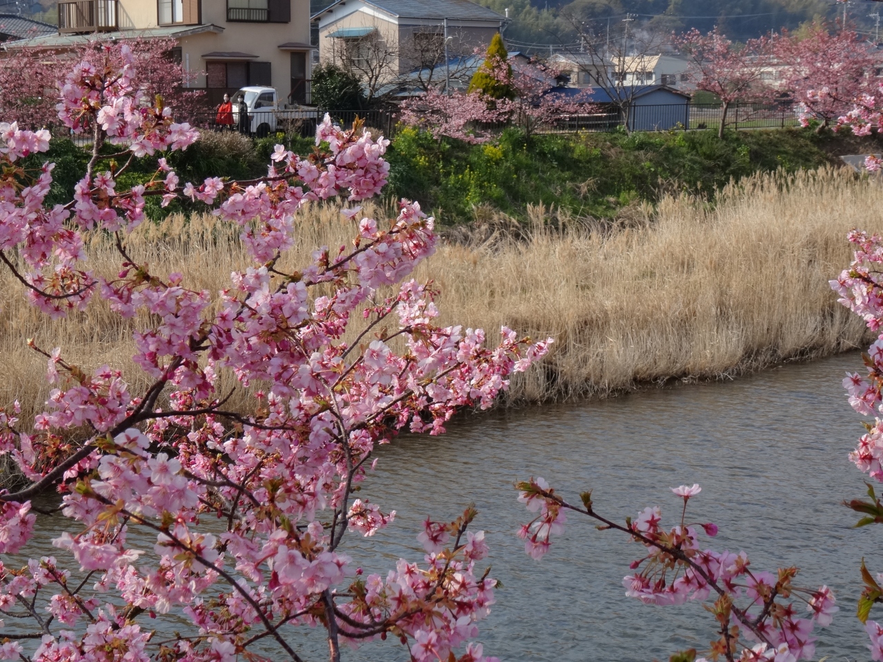 川が南北に流れており、その両側に桜の木が植えてある環境。