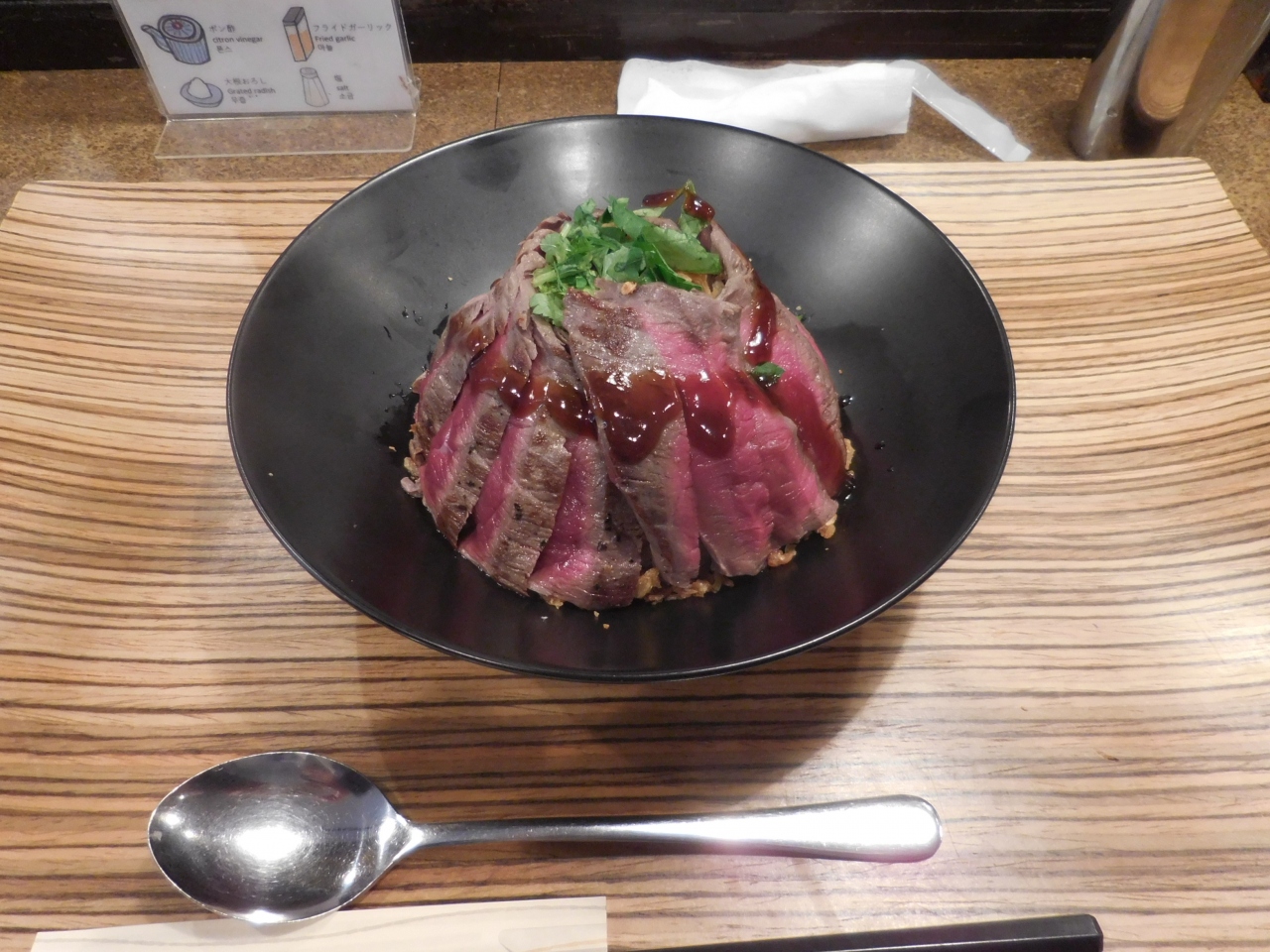 おろしポン酢ステーキ定食はつけダレとしておろしポン酢が付いてきますが、テーブルに「追いダレ」用のステーキ丼のタレが追いてあるので、味変して両方の味を楽しめます。- 旅行時期