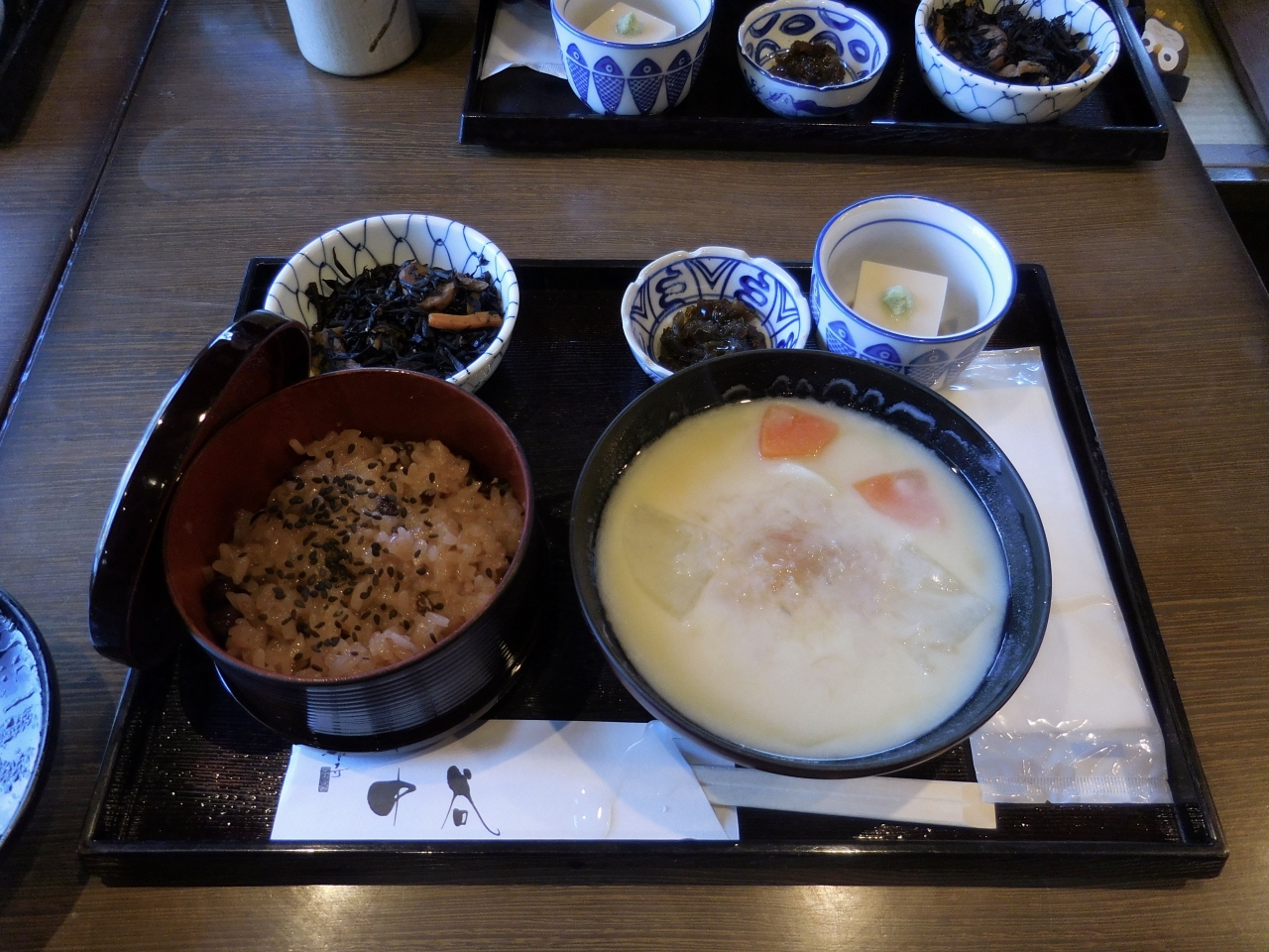 お餅屋さん?和菓子屋さん?食事処?お店の位置付けはよく分かりませんが妻が調べて朝食を予約していただきました。白味噌のお雑煮と赤飯、小鉢料理など美味しくいただきました。