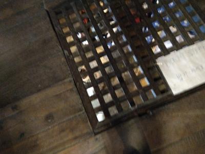 2階に上がると床に鉄製の格子がはめられていて1階と繋がっています。この地域は雨季に冠水することが多く、その際に1階の家財、資材、などを2階へ上げるための工夫だそうです。