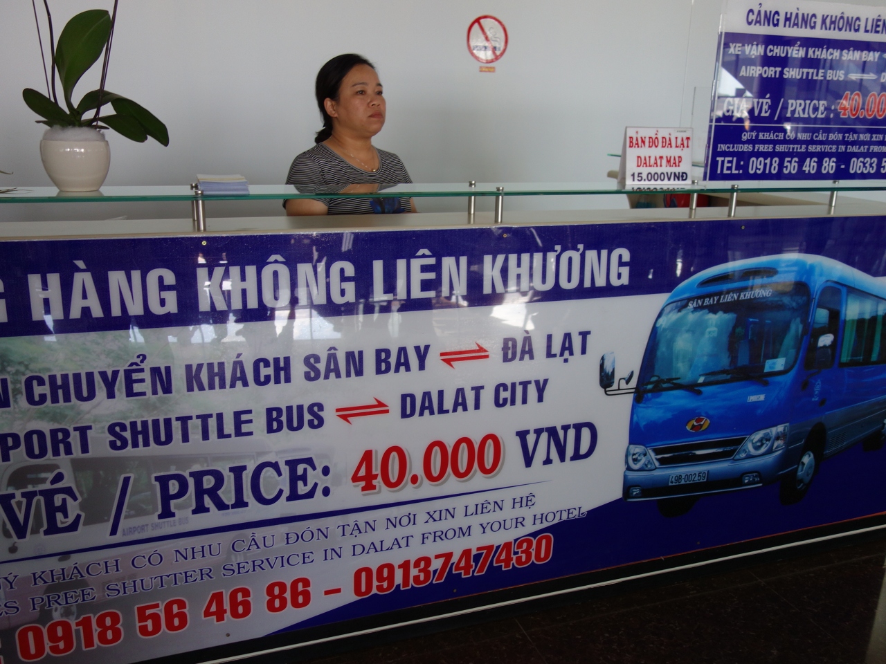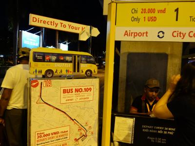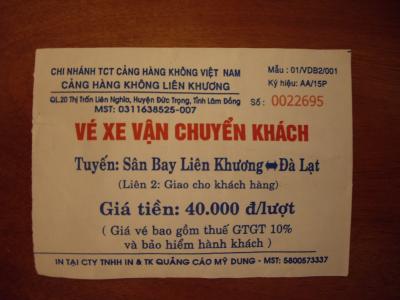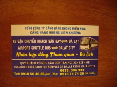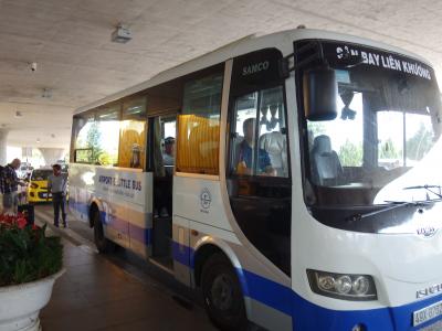 ダラット空港から市内のホテルまで、または、市内のホテルからダラット空港までわずか40,000ドン(約220円)で利用できます。空港の発券所は機内預け荷物の受け取りのターンテーブルの回っている目の前です。空港から市内までかなり遠い(約30~40分)ので、格安です。ただし、空港からは満車になるまで15分位待たされることもあります。これは、その日の到着人数によります。また、各ホテルを回っていきますので運転手に自分のホテルを告げてください。コピーしたホテルの地図を渡せばなお良いと思います。帰りは、ホテルフロントにフライト時間を言い予約してもらったほうが間違いがないと思います。搭乗時間の2時間前位にホテルに迎えに来てくれます。この場合も利用客のホテルを回っていきますので多少時間はかかります。
