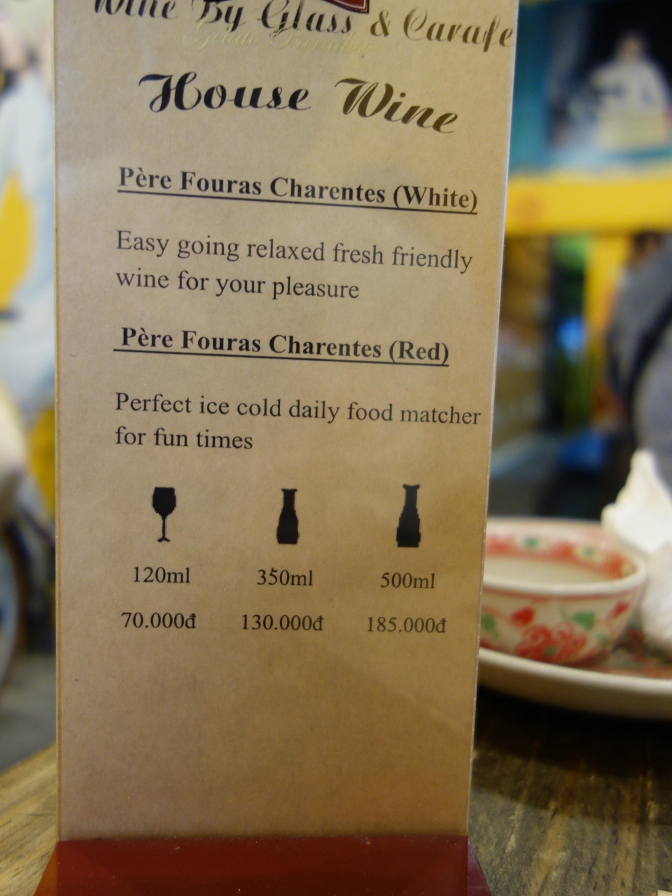 ベンタイン市場の裏通りレタントンの路地を入った奥にあります。ベトナム料理を手頃な価格ででいただけます。店はポップな作りで、サービスも明るくいい雰囲気です。生春巻き75,000ドン(375円)にグラスのハウスワイン白を1杯70,000ドン(350円)いただきました。グラスワインがあるのはワイン好きの私にはありがたいです。味も雰囲気も言うことなしです。