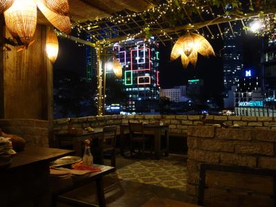 サイゴンセンターや高島屋からレロイ通りを挟んで向かい側ですが、地下鉄工事の囲いがあるためベンタイン市場から徒歩でレロイ通りに進みレロイ通り36番地を目指していったほうが分かりやすいと思います。36番地の路地を奥に進み看板のある入口を入り5階まで登ります。店内は落ち着いたカジュアルな雰囲気で、接客も丁寧です。夜景がきれいですが、テラス席希望の場合は予約しないとたいてい座れません。この日はトマトの肉詰めトマトソース65,000ドン(325円)とビール35,000ドン(175円)を注文し税金込みで110,000ドン(550円)でした。この味とサービスでこの料金は安すぎます。