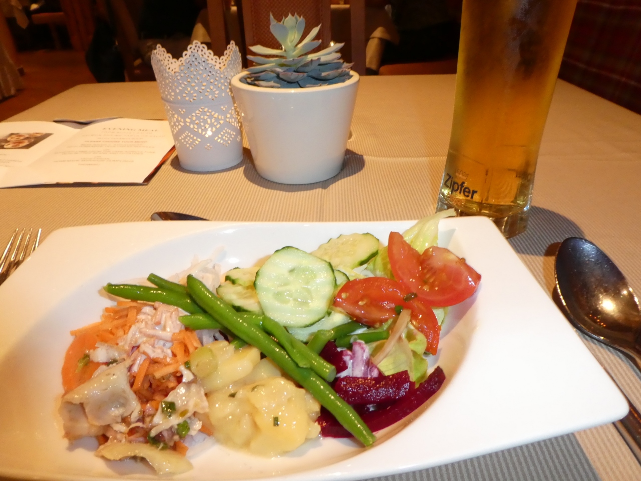 2食付きのプランにしました。朝食はサラダ、ヨーグルト、チーズ、ハム、たくさんの種類のパン、コーヒーはサーブされます。夕食はサラダバー、前菜、スープ、メイン、デザート。朝食時に夕食のメインを選びます。英語で書かれているのでわかります。ベジタリアンの方用もあります。(3種から選ぶ)私には量が多かったので、メインは半分にお願いしました。Free Wifiもあり、パスワードも不要ですぐに繋がりました。