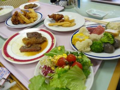 食事はまぁまぁ。種類も多く、その場で作ってくれるステーキ・天ぷら・寿司なども