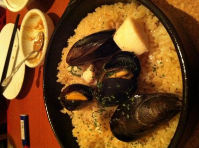 料理は俺のサラダ、ムール貝の蒸し焼きとポルチーニと栗のリゾットを頼みました。