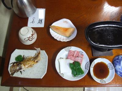 宿の名物?は、目の前で焼くイワナ。連泊だとメニューを変えてくれます(信州牛でした)
