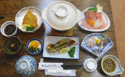 食事は、大変良かったです。小鉢類、サラダ、蕎麦、刺身舟盛り、(肉)鮑陶板焼き、 伊勢海老半身、カニ味噌汁、鯛かぶと煮、ご飯、漬物、デザート