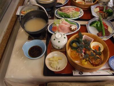 夕食は、豚しゃぶがメイン、伊勢海老半身が目をひきましたが、伊東と云う立地を考えると刺身が、質/量ともイマイチ、魚屋さんで捌いて貰ったのが出前された感じでした。