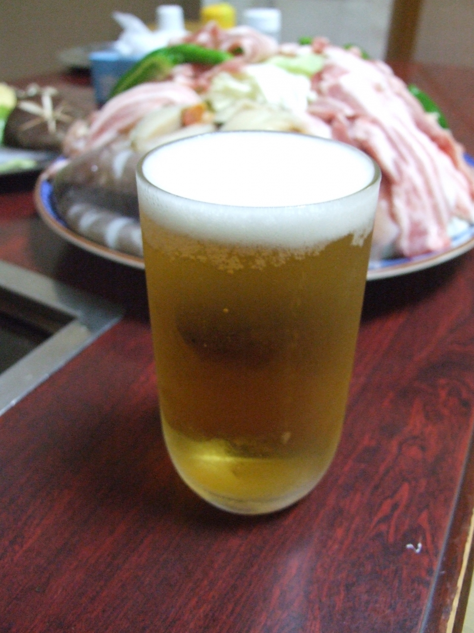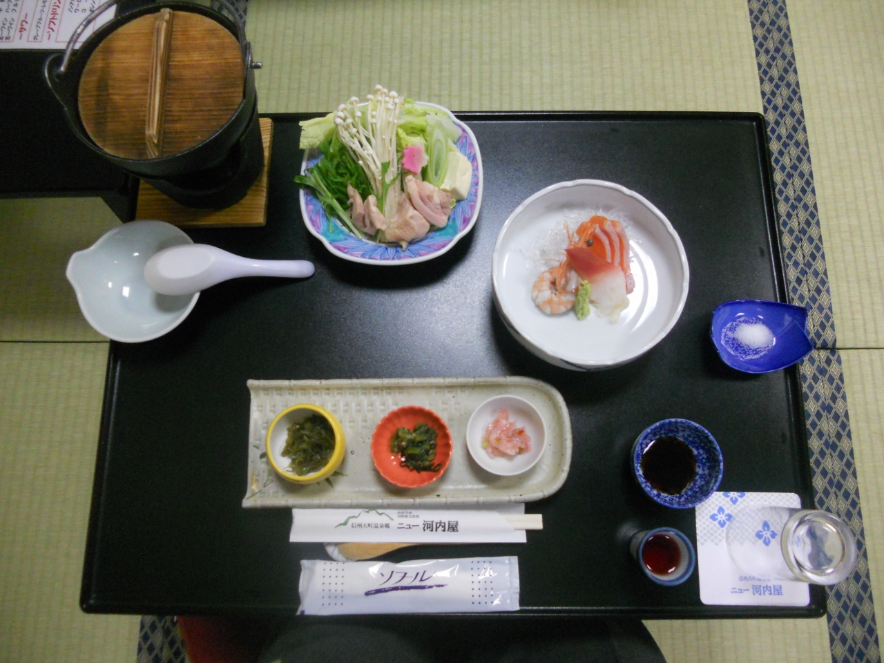 食事処にて夕食(鯛しゃぶときりたんぽ風鍋)、焼酎一杯付、生ビール飲み放題、飲み放題は歓迎ですが、前菜・御造里が無いと、宿の食事って感じがしません。朝は和食でした。- 旅行時期