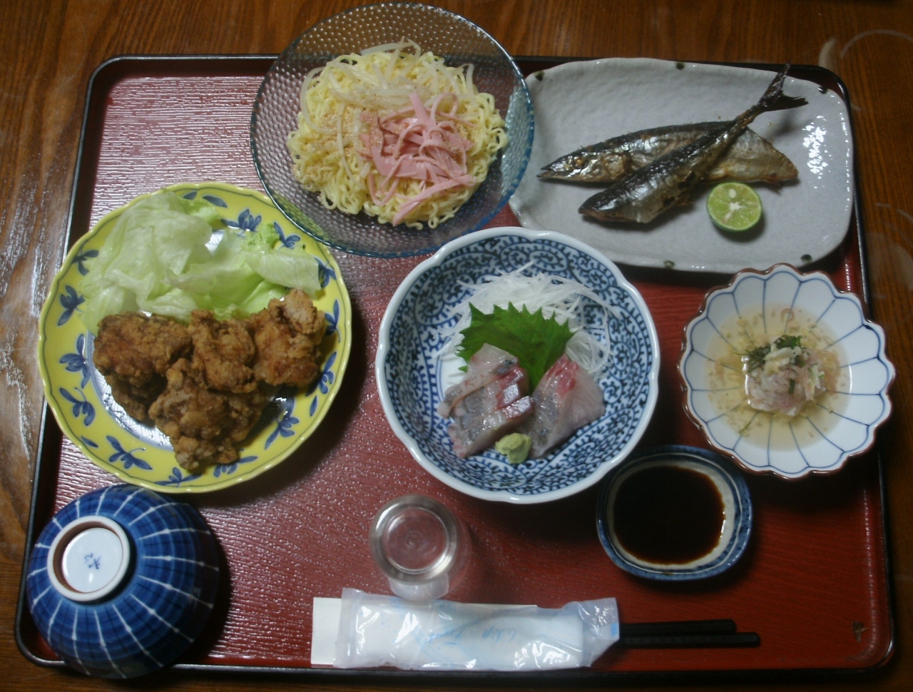 初日の食事は、どなたが来ても、海老フライがメイン、天気のいい日は、ご主人が釣って来るアジ刺も堪能できました。