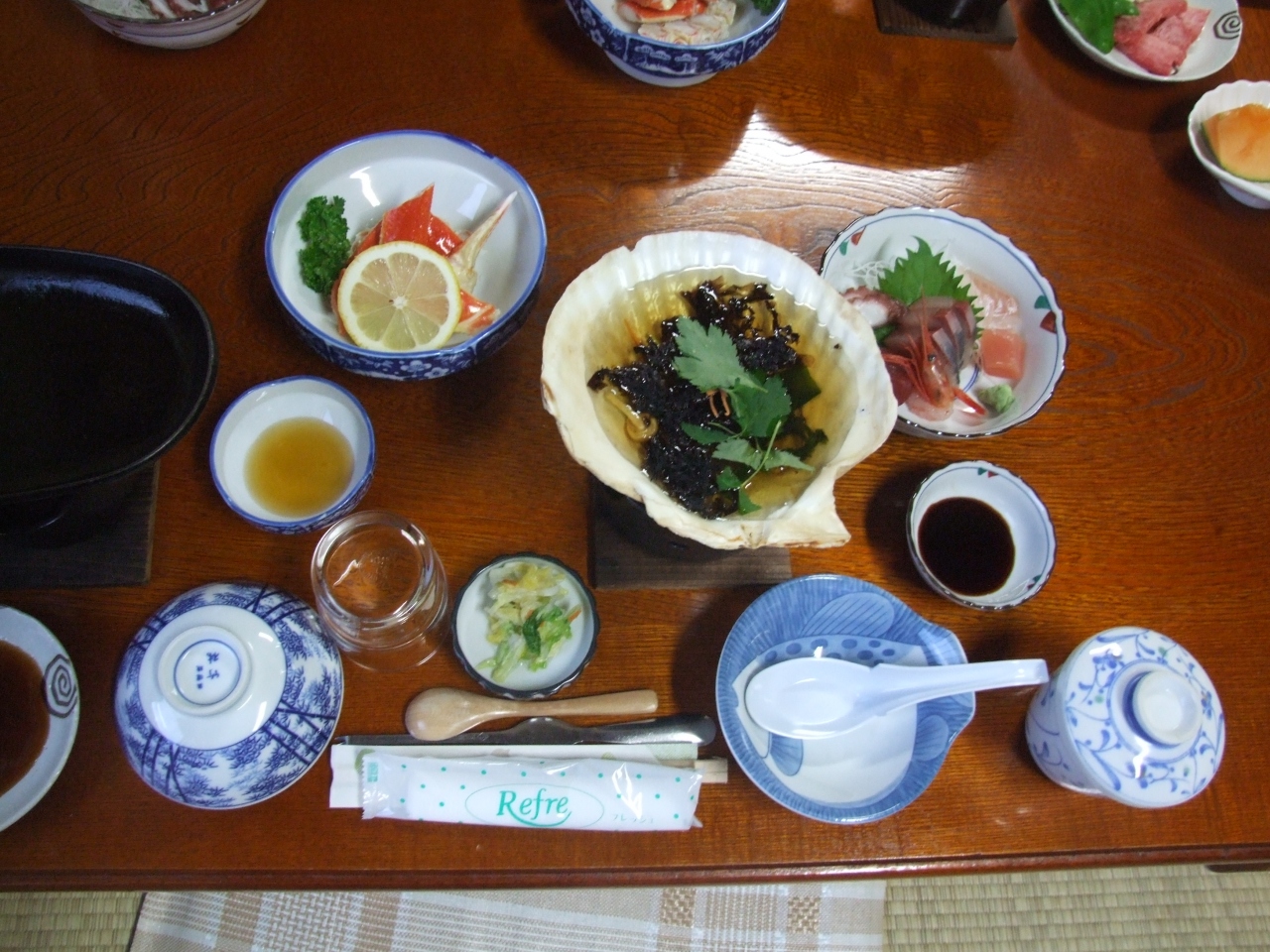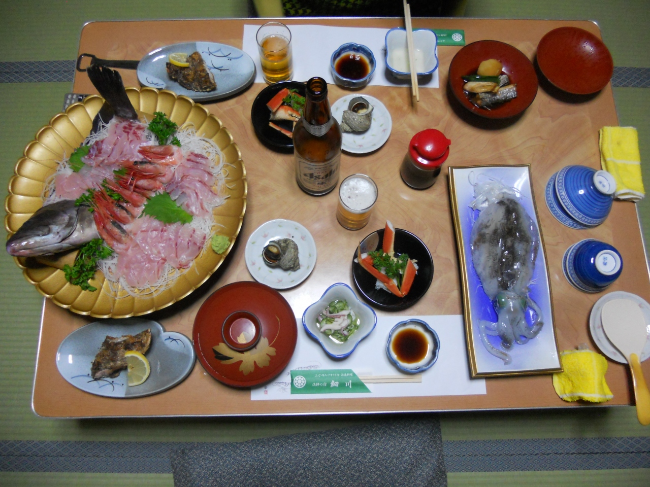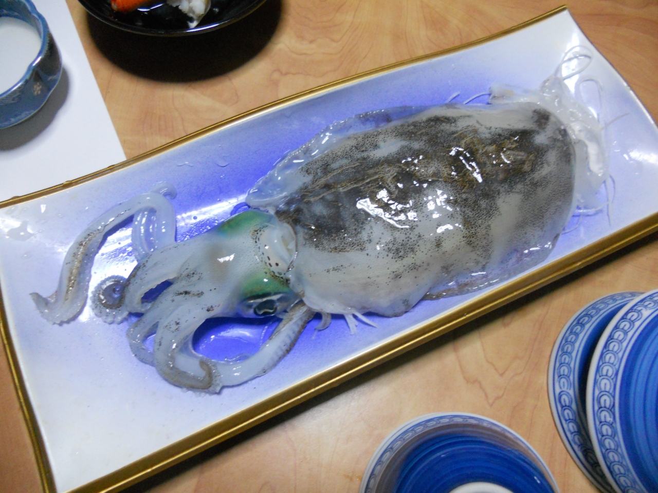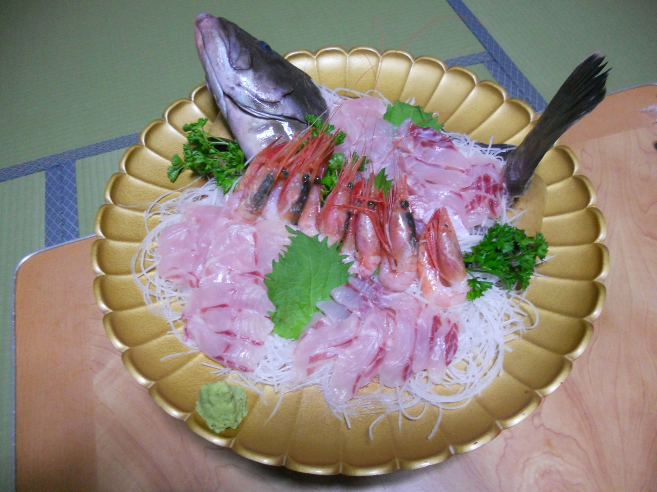 民宿ならではの料理、クエ刺(アラと同じ魚でしょうか?)アオリイカ活き造りを堪能 できました。