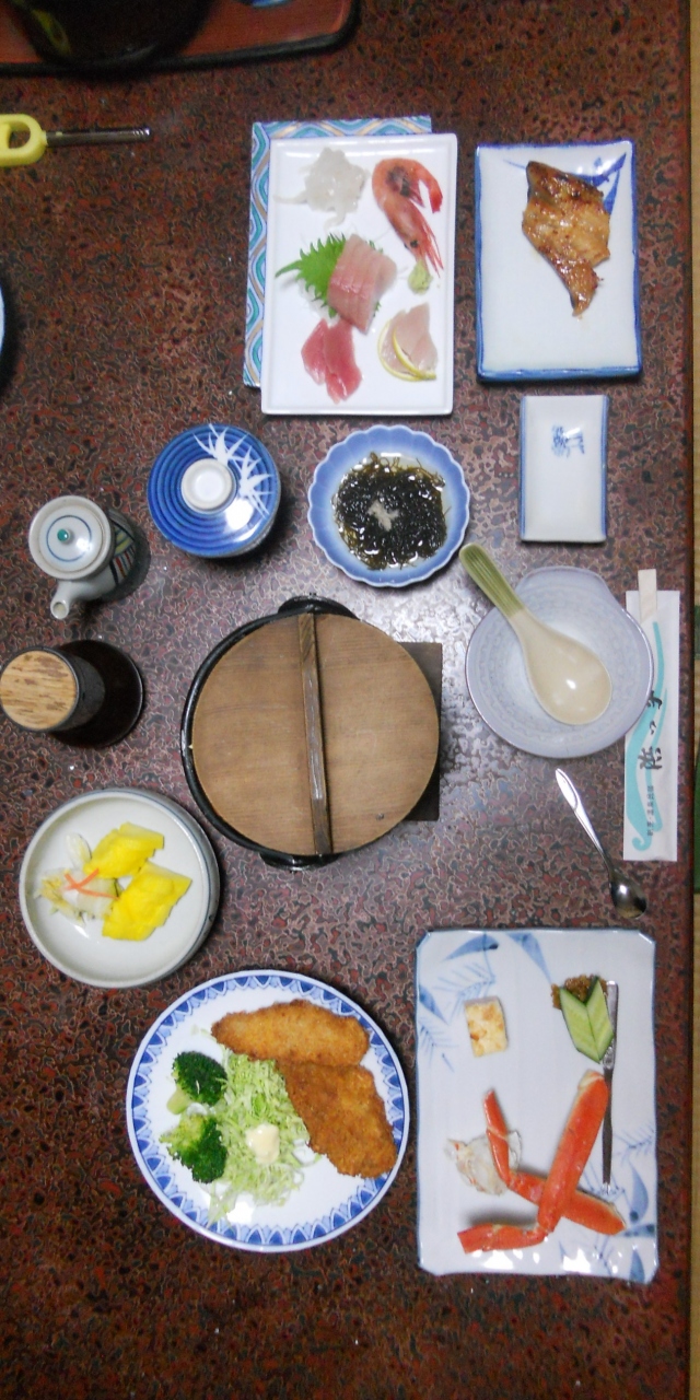 食事処での夕食は懐石風 中居さんは、お婆ちゃんばっか、食事は彩どりも良く品数も多く、個々いいお味で、温かいものが出ました。おいしくいただけました。
