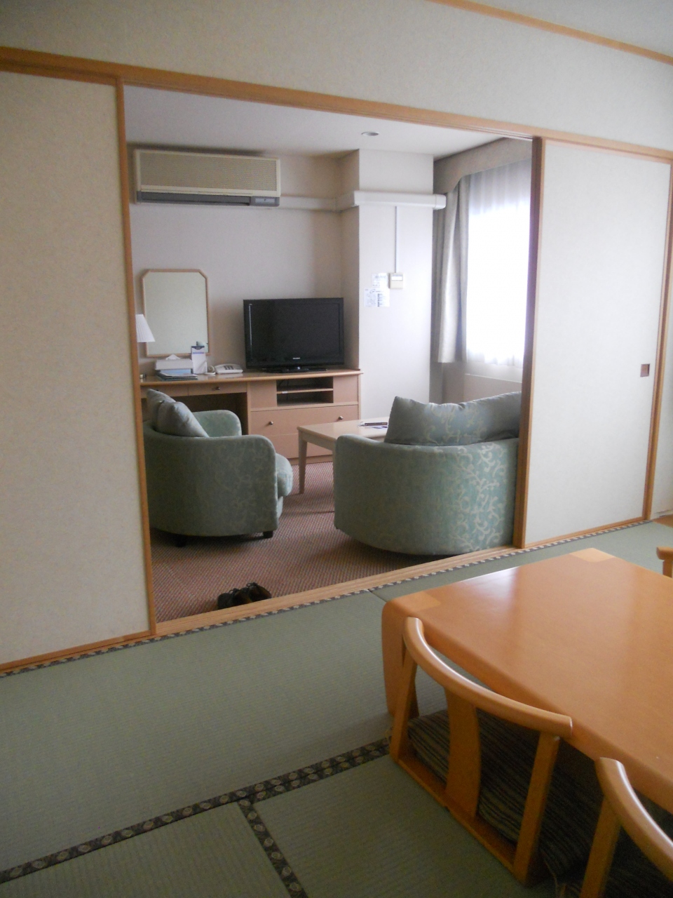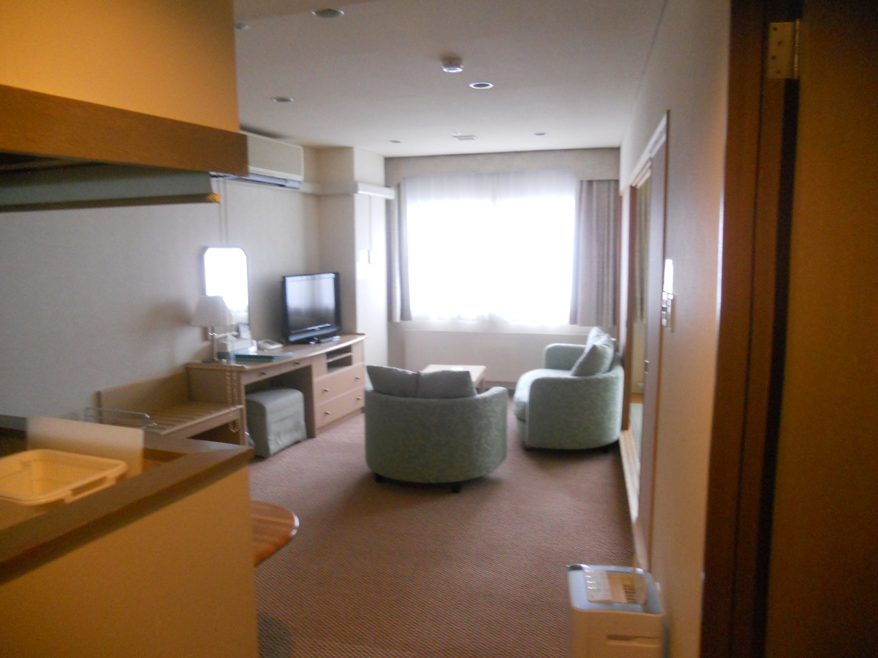 部屋は、ロングステイ対応の広々タイプ。和室、居間、DK、洋室(2ベッド)で、TVも大きい、暖房設備は整ってます。アメニティーも充分です。何よりお酒等を堂々と持ち込み出来るのがぃい。部屋⇒風呂⇒フロントへと移動距離(片道10分)が長いです。