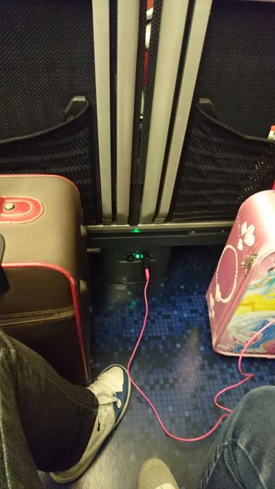 スカイライナーの車内。足元にコンセントあるのね。北総線経由になってから...