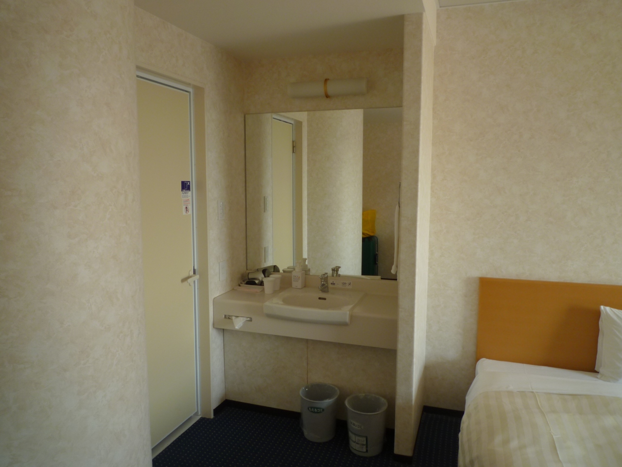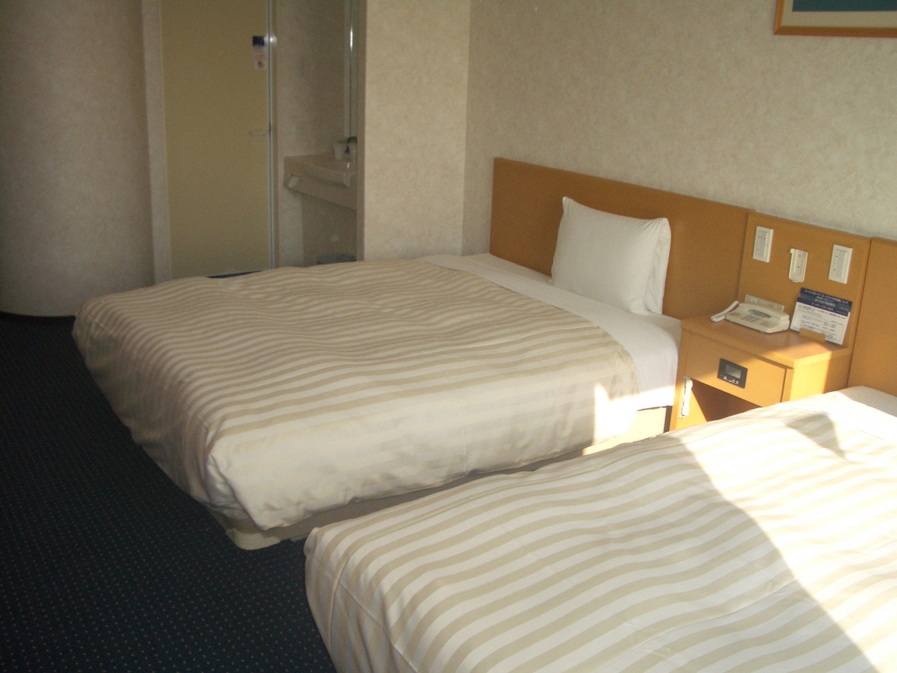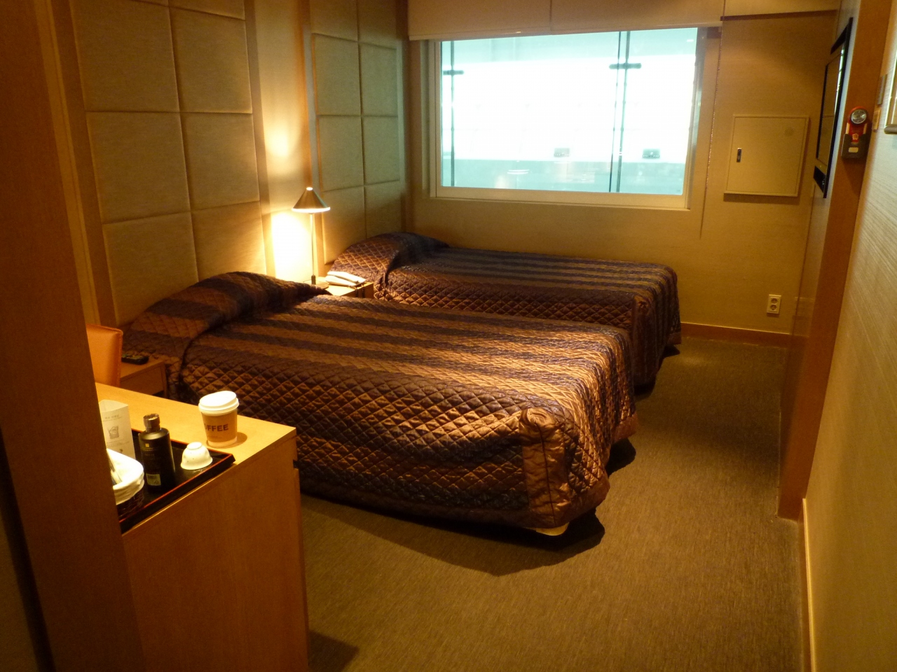 私たちが泊まった1階のホテルルームはシングルベッドが二つ並ぶとあまり余裕はなくベッドの上でスーツケースを広げました。