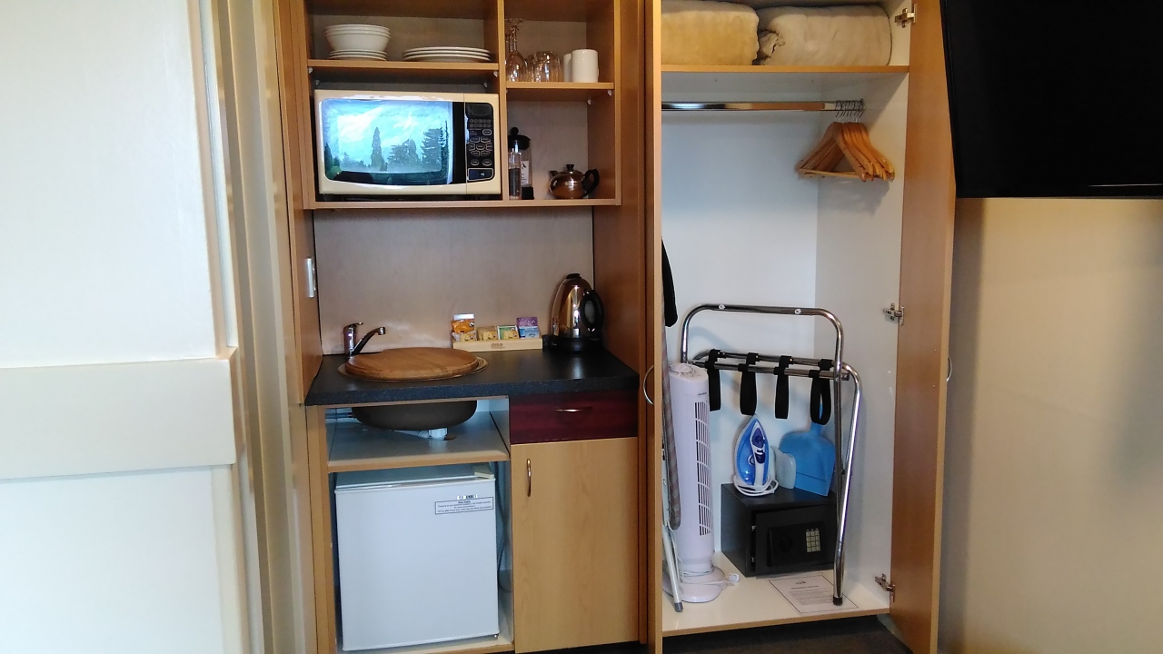 部屋やバスルームは広さが十分で使いやすく快適でした。何をおいても部屋幅いっぱいの大きな窓からはマウントクック周辺の山々が見渡せて、ソファーから眺めるその景色は最高のものでした。