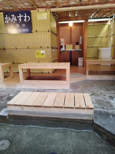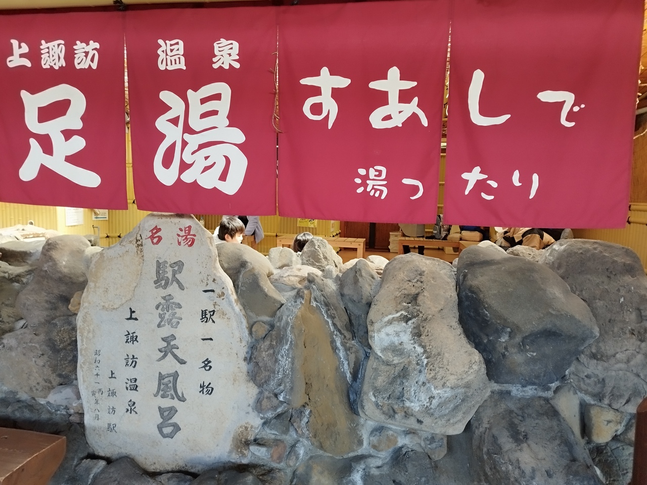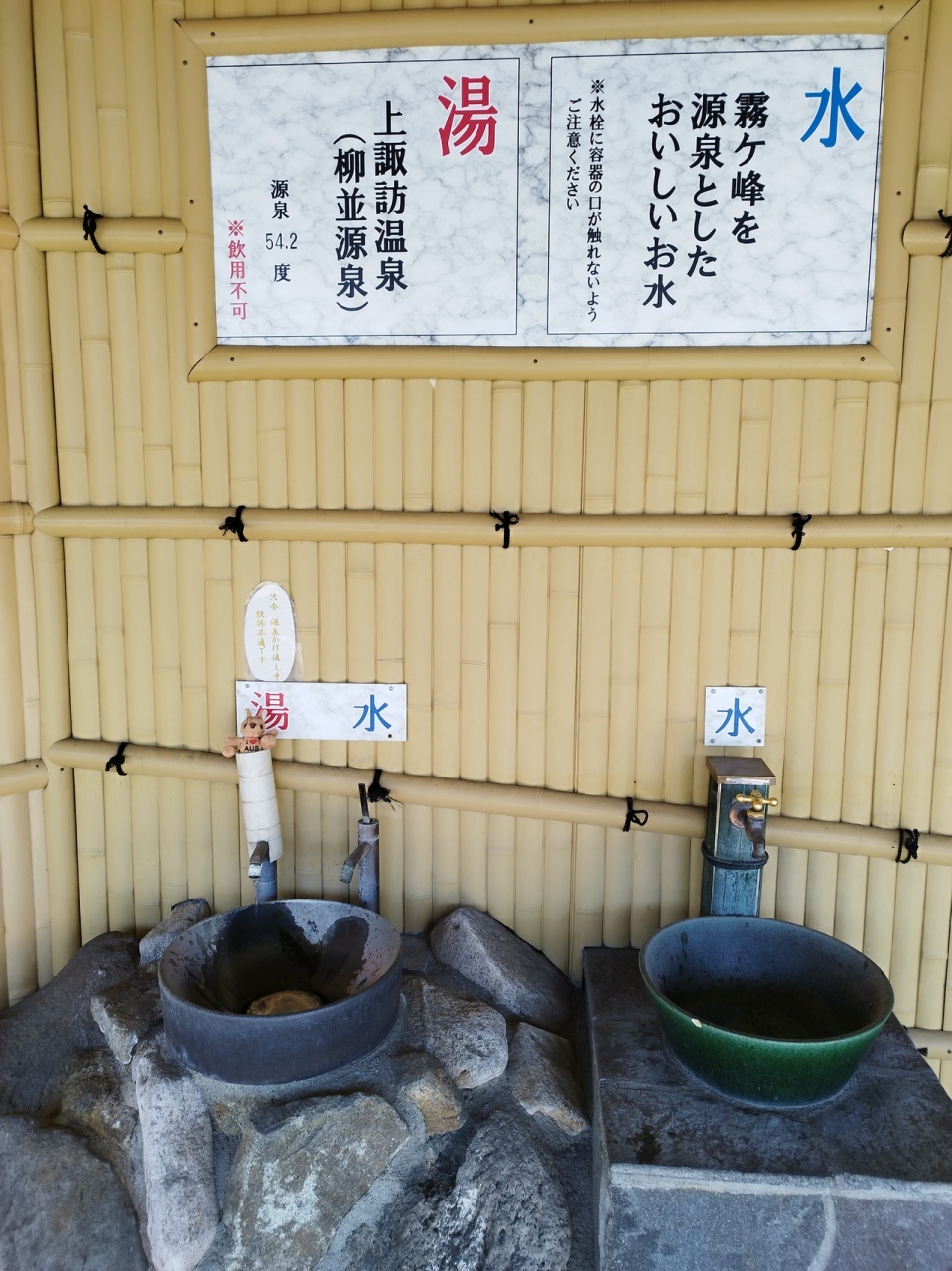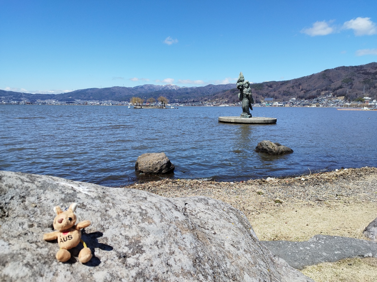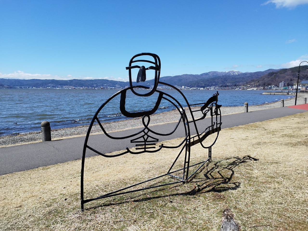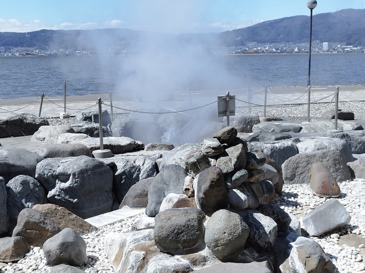 石の彫刻の他に鉄のオブジェや、足湯、間欠泉センター、ボート乗り場などが周囲に有り、諏訪湖観光のスタート地点。