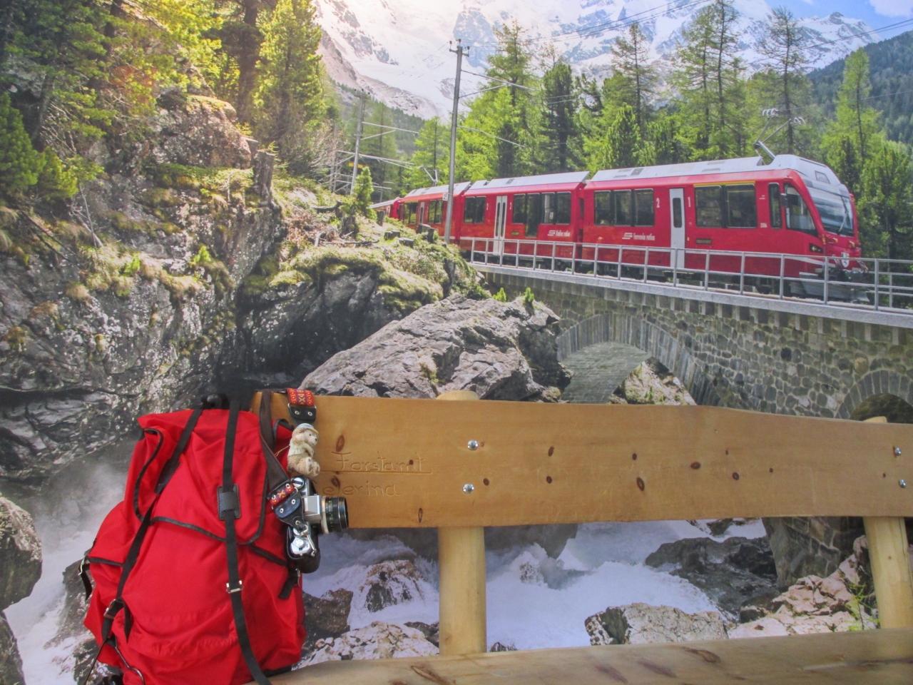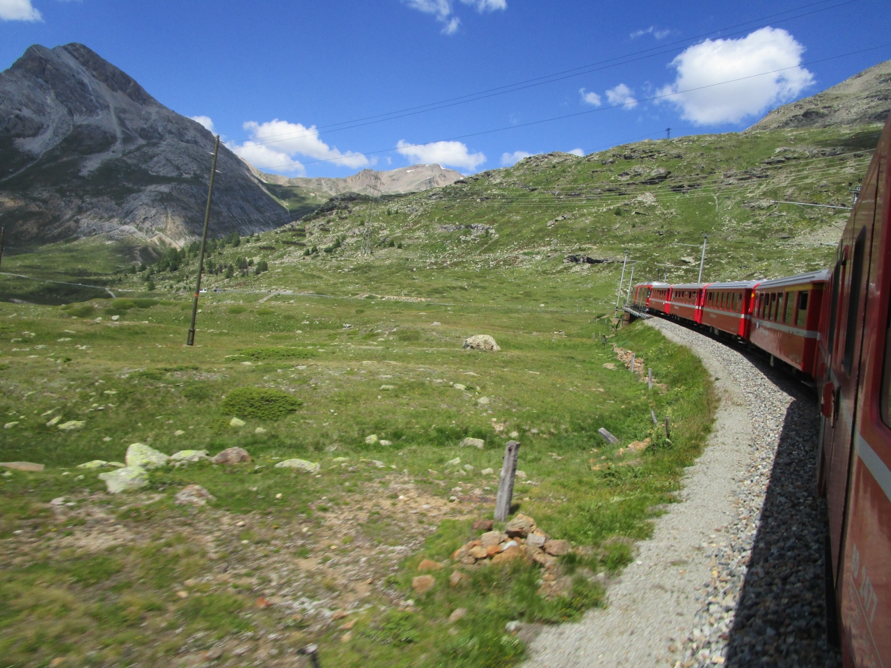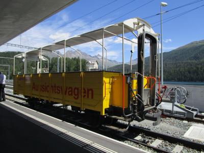 サンモリッツ駅からベルニナ線(ベルニナエクスプレスおよび普通列車いずれも時間帯によりトロッコが連結されます)の普通列車に連結されたトロッコ列車に乗りました。