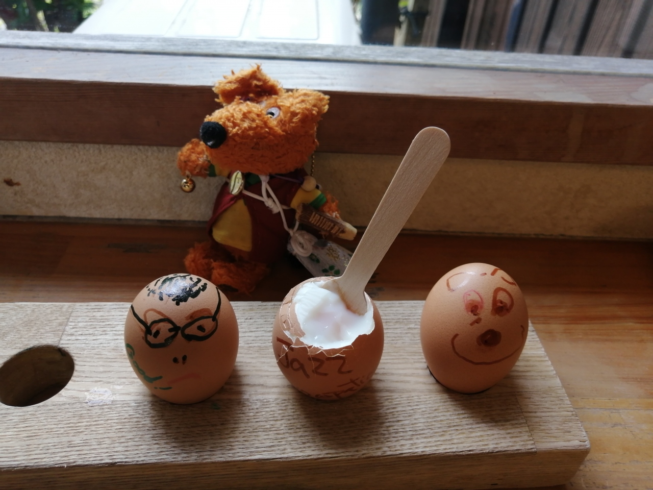出来上がったら、専用のパンチで叩いて、温泉卵の頭を割ります。