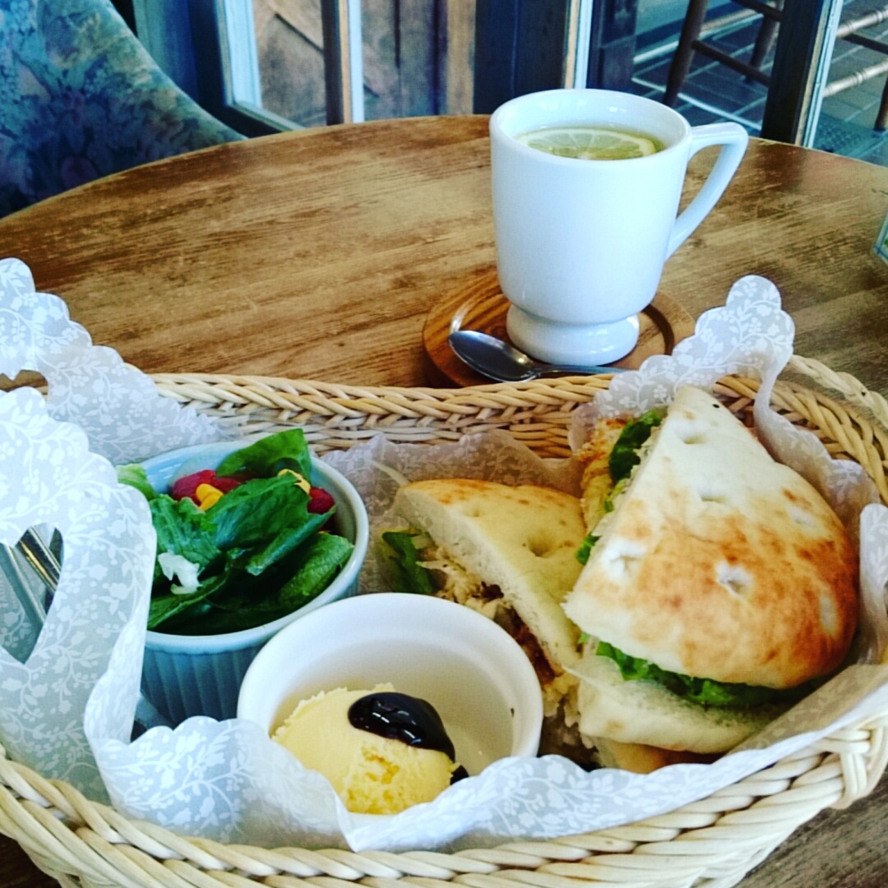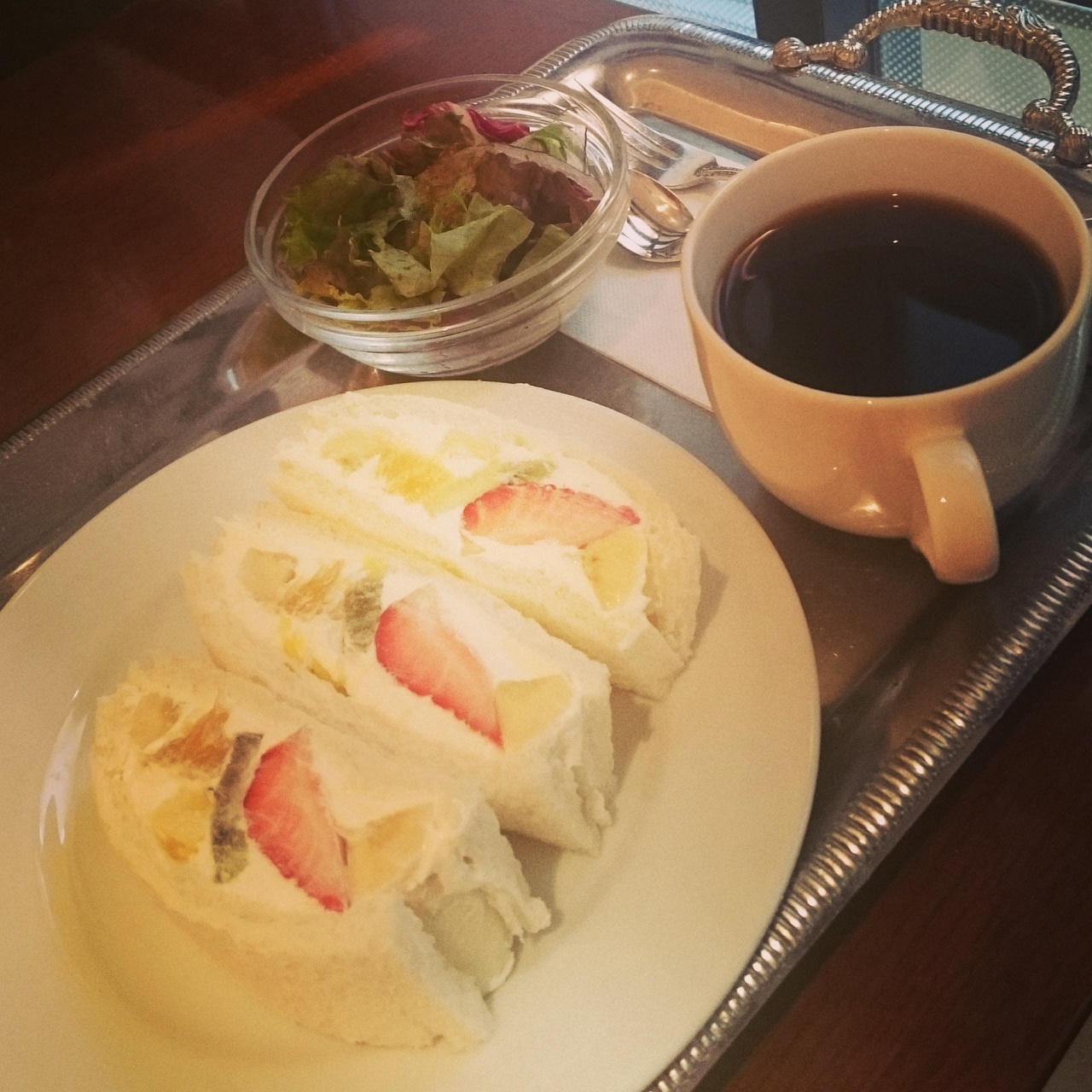 ハーフサンドセットというお得なフルーツサンドのセットがあります。季節によって中のフルーツが変わるようですが、今はイチゴが入ってて見た目も味もよかった!生クリームが苦手な私ですが絶妙な甘さで、コーヒーと良く合いました。セットのサラダがなにげにおいしかった。