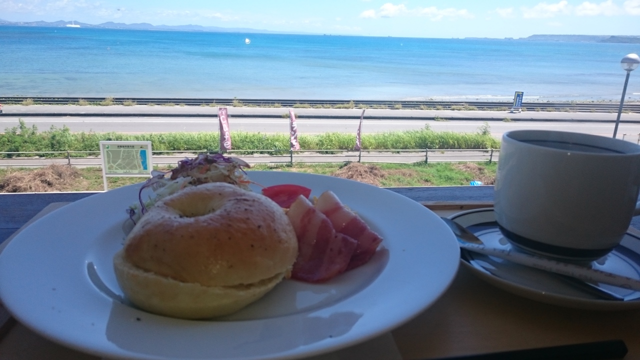 平日の10時頃おじゃましましたがお客さんは地元の方がお一人様でした。さすが沖縄!濃いブルーの最高の海が目の前に広がります。11時まではモーニングがあり、なんとワンコイン!近くなら通いたい。ベーグルはもっちりでとってもおいしかったです。