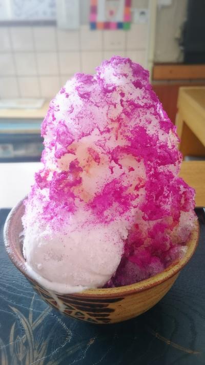 座喜味城跡の前にあります。雑誌で見たこのお店オリジナルの紅芋黒糖ぜんざいにしました。まずは見た目が美しい!紅芋アイスと、白玉が2つ、やわらかい金時豆がかくれています。一般的な沖縄ぜんざいは色々食べすぎて飽きてきたので、パンチが効いててよかったです。お店は狭いので、休日にはきっと込み合うでしょう。