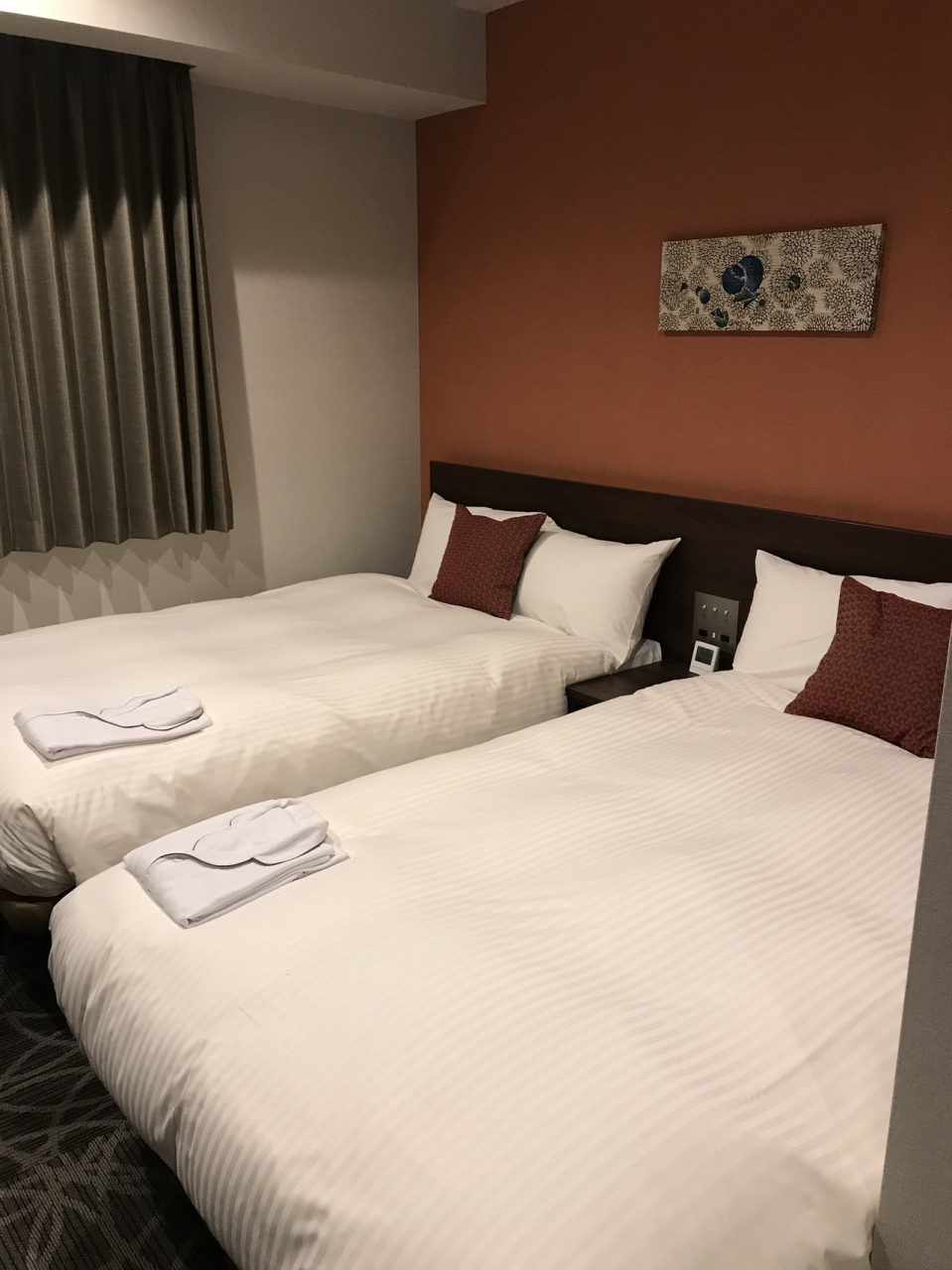 駅前の大きなホテルです。部屋は綺麗ですが備品や水回りがちょっと古いですね。機密性がいいのか暖房無しでも暖かく、とても静かです。夜は無料ラーメンがあり、お部屋で食べる事もできます。作ってくれる女性の方がすごく感じが良かったです。