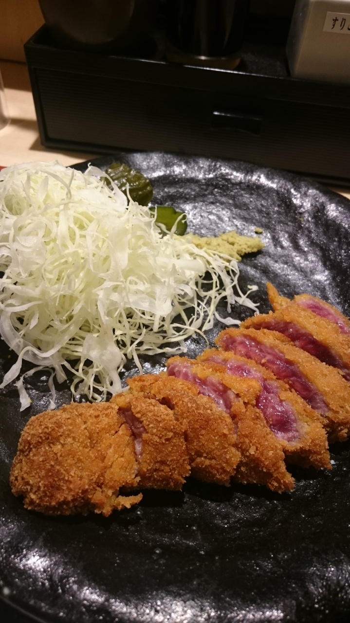 日曜の夜でしたので3組並んでました。店内は狭いです。カウンターに通されました。一番オーソドックスなロースカツに。衣が少し甘くて、塩、わさび醤油、カレーの付けダレ、ソースといろんな味で楽しめました。