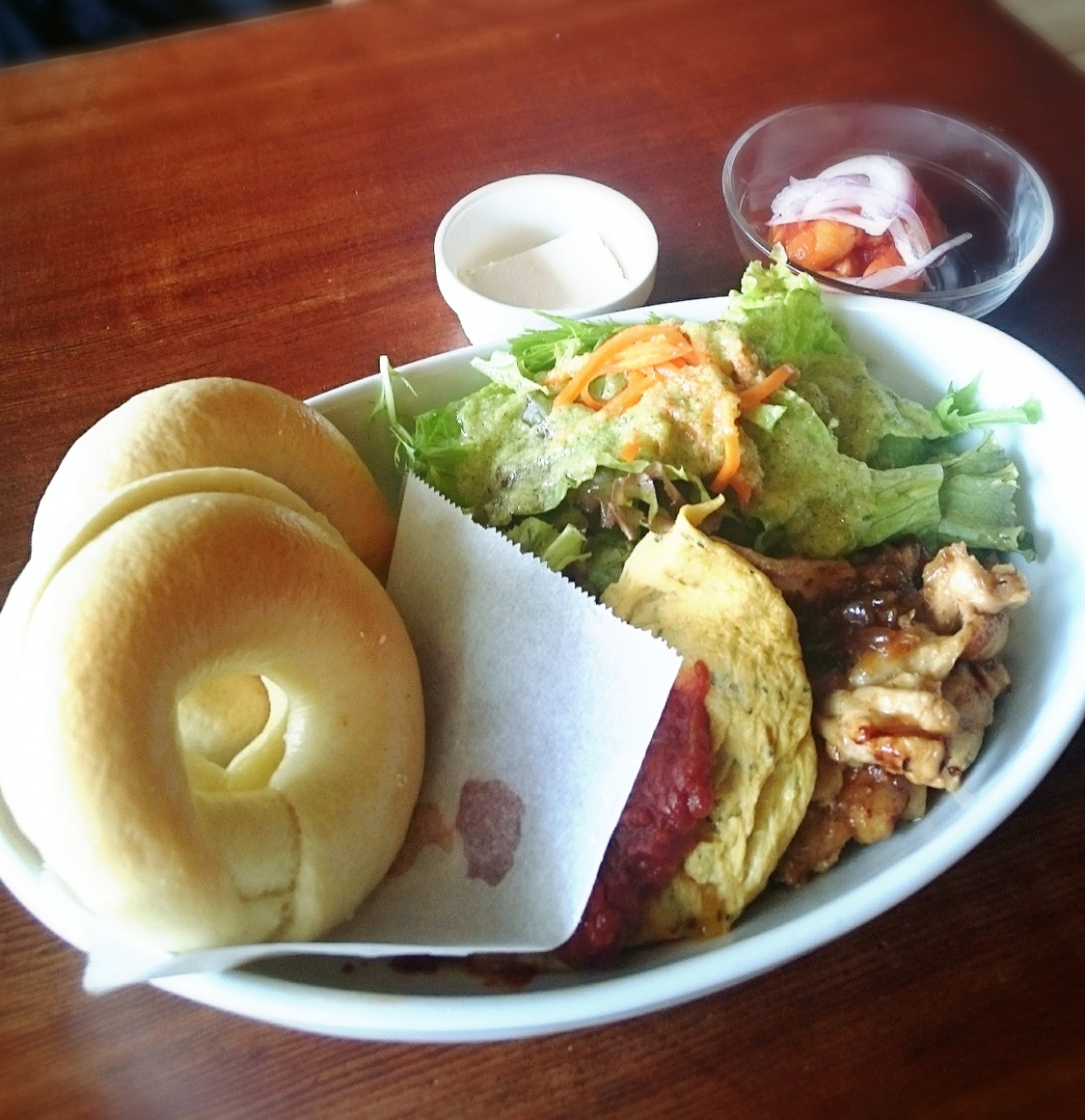 平日でもランチはほぼ満席です。四人掛けやもっと広いテーブルが多く、1人は座りにくかった。ベーグルのオープンサンドは美味しいですが、ドリンク無しでこの値段は高いかな?スタッフの女性二人は終始おしゃべりしてるし、外国人のお客さんともしゃべりまくりで私のお水がなくなってるのになかなか気づいてくれませんでした。