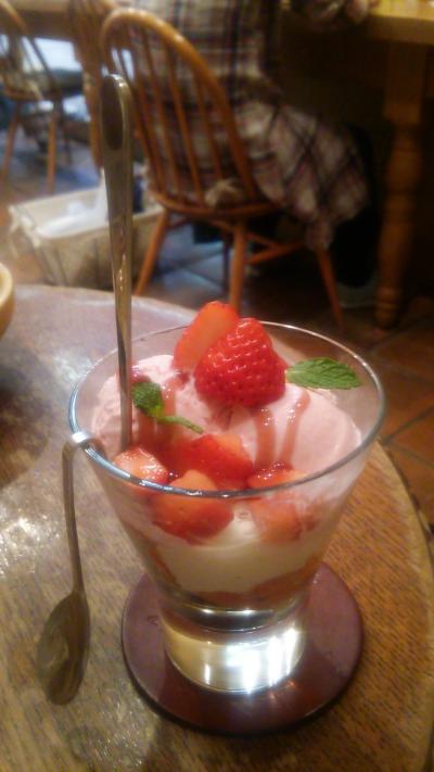 博多アミュプラザの一階です。席はとても少ないし、狭いです。平日の夜でも女子でいっぱい。イチゴのパフェは、アイスにミルクプリンと、底にはグラノーラ。生クリームを一切使ってないところが私には嬉しい。とってもおいしかったです。もっと広ければなぁー。