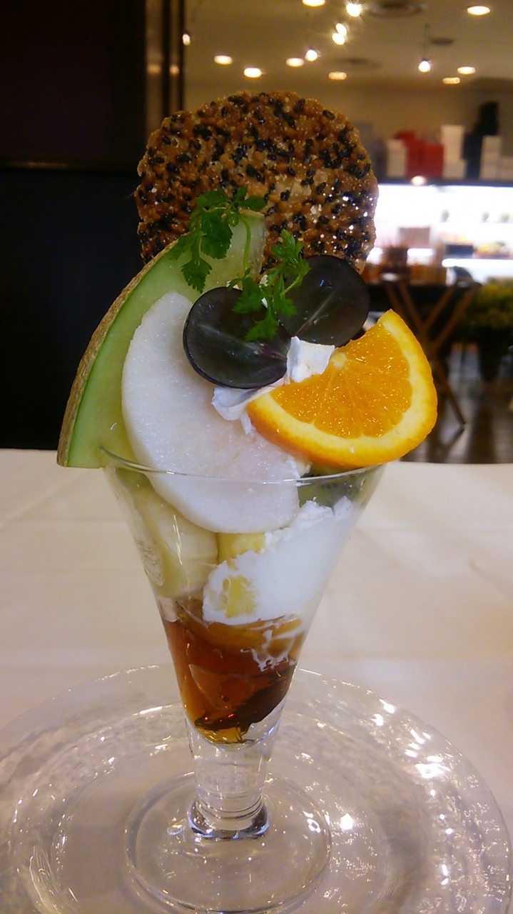 メロン、巨峰、バナナ、リンゴ、パイナップル、梨、オレンジ、バニラアイス、紅茶ゼリーに、ごまのチュイール。生クリームが苦手な私には嬉しい、生クリーム少なめです。