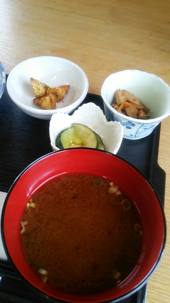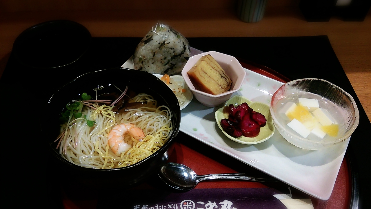 ランチはにゅう麺とおにぎりとちょっとした小鉢のセットが550円。おにぎりは6種類から選べます。ひじきちりめんにしました。