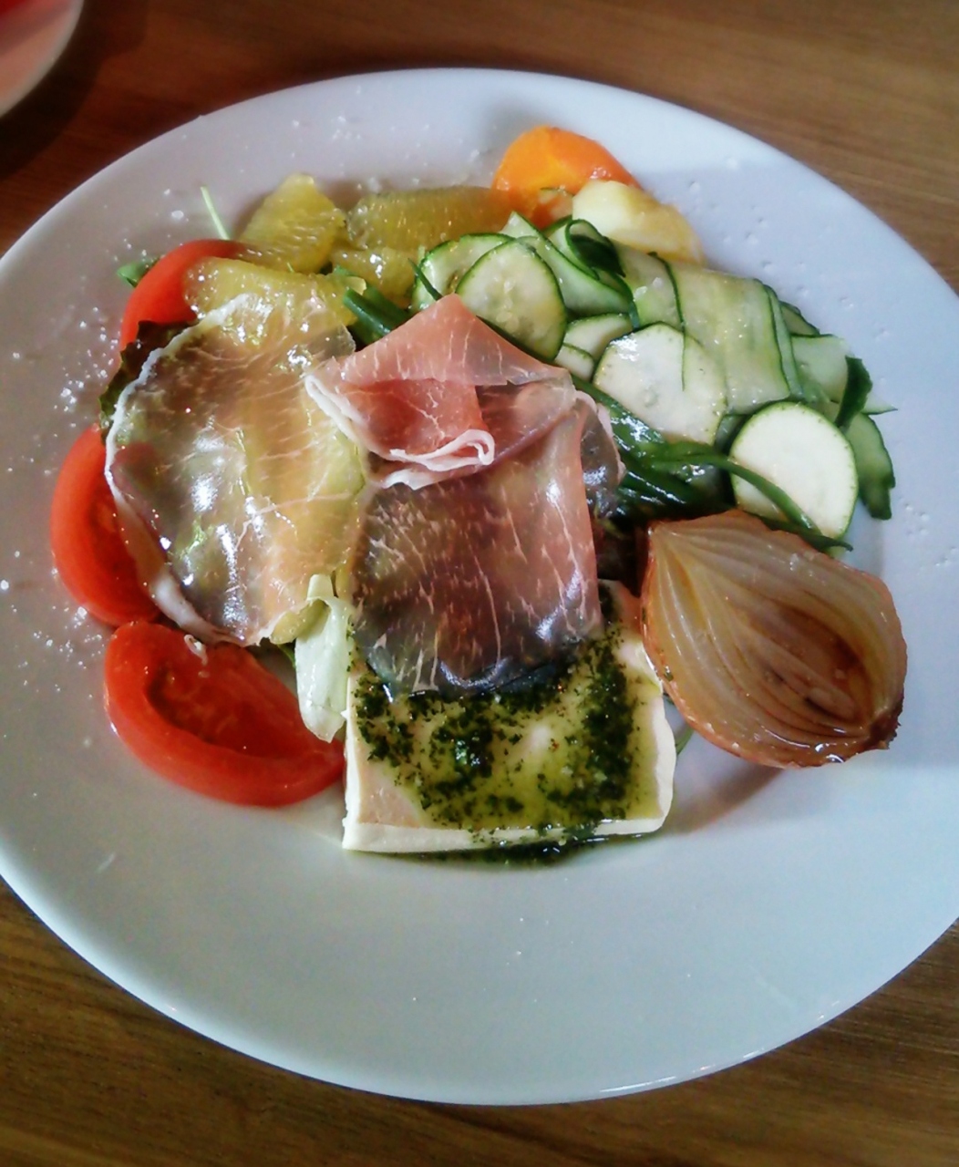 オリーブオイルと塩とバルサミコのシンプルなドレッシングですが、生ハムの塩気と豆腐のバジルソースで美味しく頂けました。