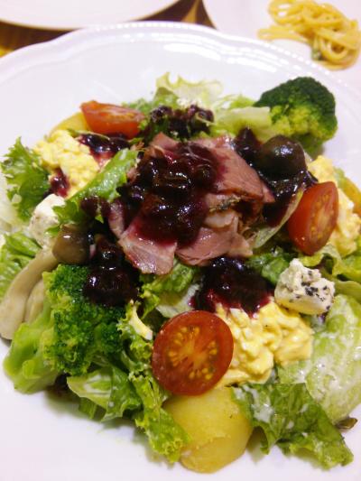 平日ランチはワッフルがお替り自由で1200円。わたしはパンチェッタのサラダのセットしました。まずはワッフル。焼きたてでさくさくのフワフワです。紅茶ベースのソースが付いてきます。メイプルほど甘くなくて気に入りました。サラダにはクリームチーズ、パンチェッタがトッピングされており、ブルーベリーソースがかかっています。珍しいソースですが甘ったるい訳ではなく、サッパリとしてとても美味しかったです。