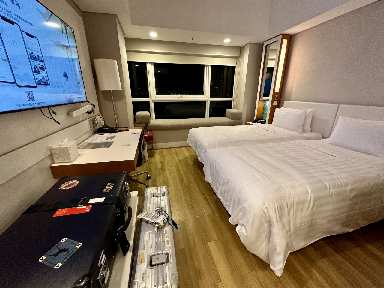 室内は特に広いというわけではありませんが、必要なものは揃っているし、清潔で綺麗でした。小さな窓からのviewも銅鑼灣のタイフーンシェルター、ホンハムのフェリーピアなど、九龍側や中環のホテルからでは見れない景色でとても気に入りました。