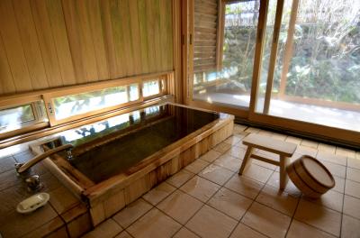 お部屋には広い檜風呂があり、ゆっくりとお湯に浸かることができます。