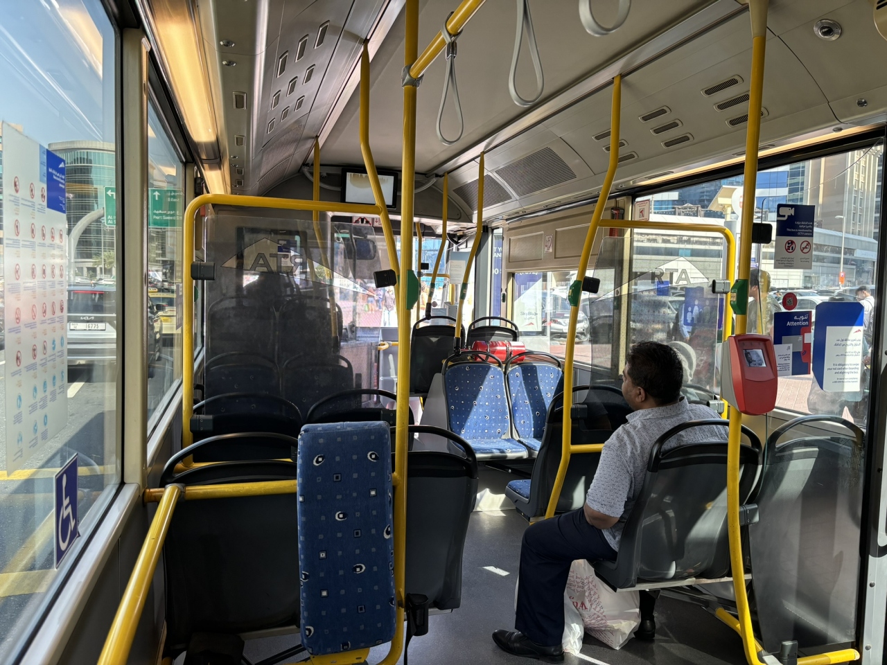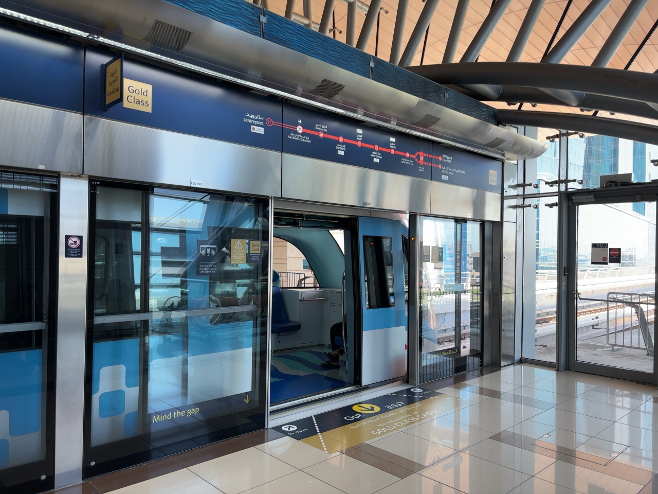 スパイススークやゴールドスークを巡った後にアブラでドバイクリークを渡り、オールドスークを抜けた先でドバイメトロの駅を探したらアルグバイバ駅にたどり着きました。アルグバイババスステーションもすぐそこでした。元気な時は徒歩圏だと思いますが、既に足が棒だったので宿のあるブルジュマン駅までちょい乗り。同じ考えの観光客が多いのか夕方は結構乗り込む人も多く混み合いました。
