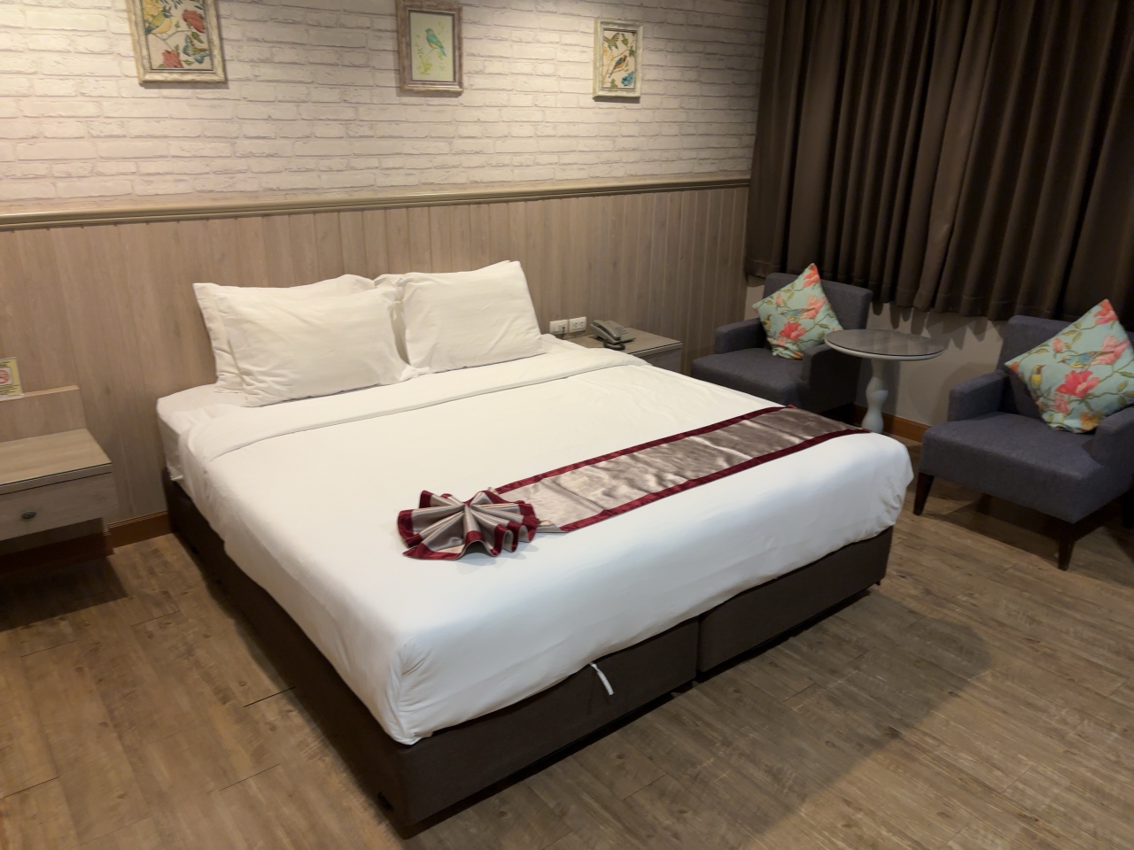 スワンナプーム空港に夜遅く着で、翌朝の乗継便まで仮眠を取るために、空港からタクシーで10分と近いこちらのホテルを選びました。エントランス周辺にはオーナーのコレクションと思しき、巨大ロボット像がずらりと並んで壮観です。屋上にあるバーから離着陸機を間近で愛でられると言われましたが、チェックインが午前2時を過ぎてしまったため、断念しました(チラ見に行くとそんな時間帯でも営業はしていました)。部屋も清潔で快適ながら、唯一にして最大の難点は丑三つ時まですぐそばの屋外ライブハウスから大爆音が流れ続けること。耳栓はマストだと思います。