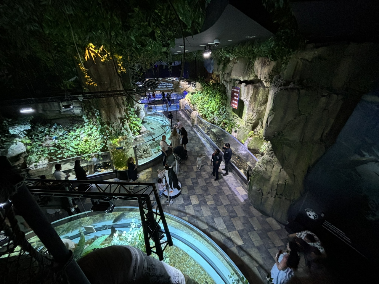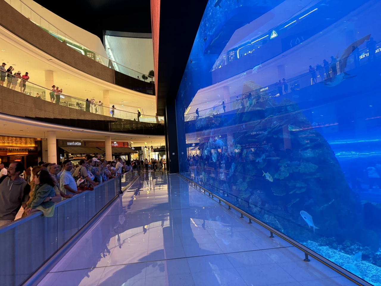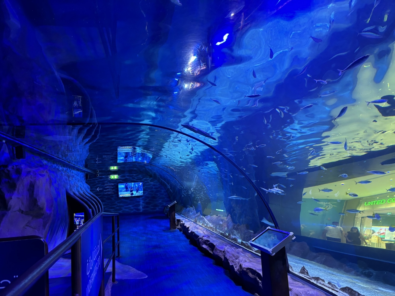 世界最大の水族館と謳ってはいますが、ショッピングモールの一角で手狭な空間をあれこれ工夫して展示をしている印象。入場券には数パターンありますが、もっともリーズナブルなものでも、2か所に分かれた展示スペース両方入館可でした。まず上階の方から入ると、割とオーソドックスな展示です。シンプルに一方向へ進むのではなく時折ちょっと戻ったり脇道から階段を上下したりとトリッキー。最大の呼び物の巨大水槽、実はお高い入場券が無くても誰でも外から鑑賞できるため、大多数の観光客はそちらで満足しているようでした。