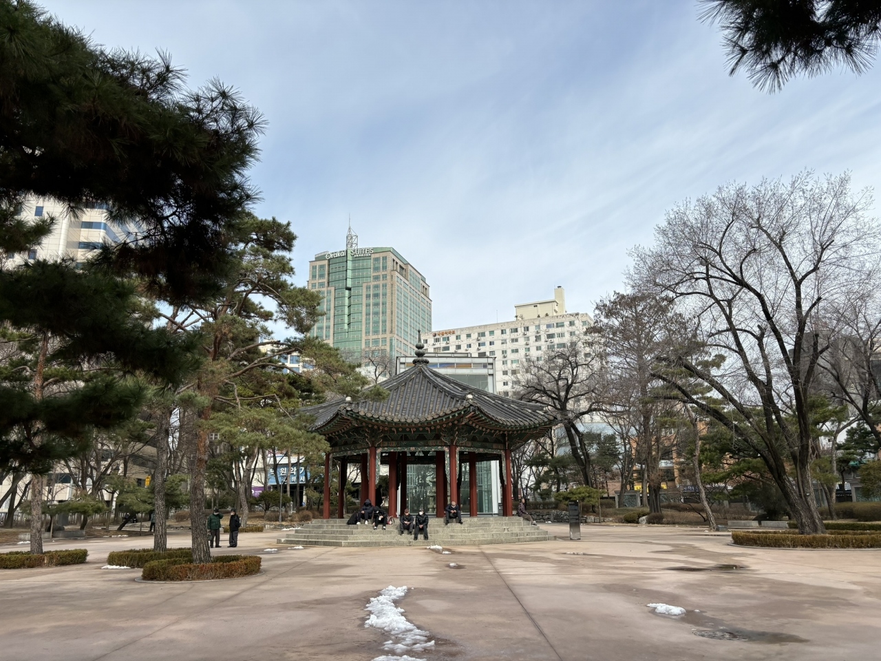 鍾路3街界隈からあてもなく朝散歩をしていたら、鍾路と世宗路の交差点の角にひっそり佇む建物が。朝鮮王朝の高宗皇帝の即位40年を祝った記念碑だそうです。説明文には英訳のほか、日本語訳も。「古色蒼然とした記念碑」という言い回しは間違ってはいないものの、何となくネガティブに聞こえなくもありません。周囲は柵に囲まれています。
