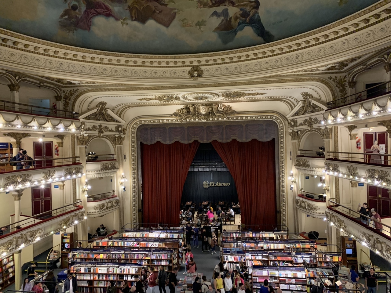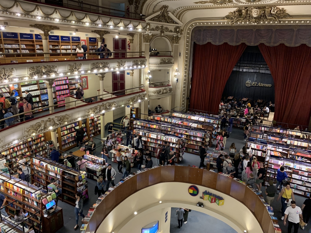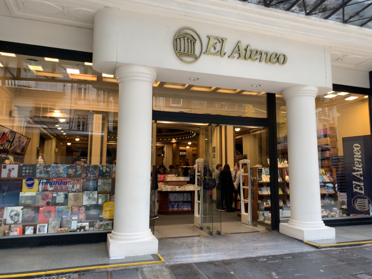 Diagonal Norte駅でB線に乗り換えCallao駅下車、かつて世界一美しい書店にも選ばれたエル・アテネオ・グランド・スプレンディドを訪ねました。入口は京都の四条通辺りにありそうな普通の店構えですが中に入れば別世界!まさしく京都の鰻の寝床みたく果てしなく奥へと続きます。以前は劇場だった空間がそのまま本屋さんに。なんとも贅沢です。かつての舞台は喫茶スペースに生まれ変わり大賑わい。ボックス席には椅子が配され、売り物の本を読み耽る姿も見られました。エスカレーターで結ばれた地下には児童書やレコードが並んでいます。どこから見ても豪華絢爛。本のバーコードを読み込めば値段や詳細情報が分かる仕組み。実は本屋さん自体はチェーン店で、一般的なラインナップだとか。自分も絵葉書の購入のみでしたが、存分に満喫しました。