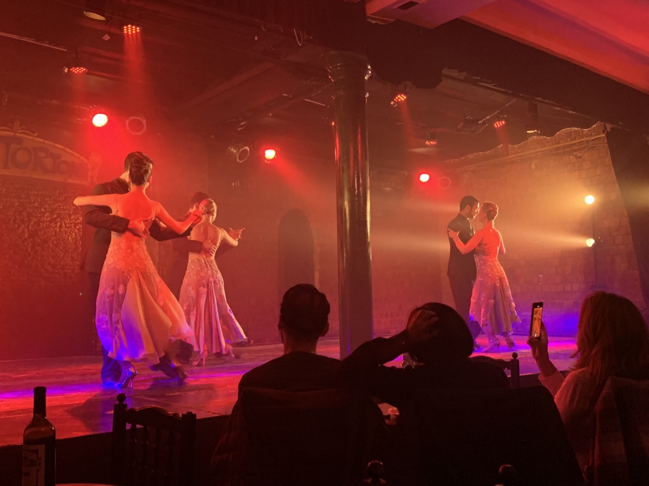 老舗カフェを訪ねたのは、夜のタンゴショーのため。ホームページから事前予約について英語で訪ねても応答なしだったので、地元の友人に頼んでスペイン語で取り次いでもらい、無事にチケットをおさえられました。開演20時より早くに着けば、かつて文化芸術の拠点だった華やかなカフェで食事も楽しめます。滑り込みセーフの自分もカフェラテだけ。タンゴショーは地下の舞台にて、赤ワインと一緒に満喫しました。ブエノスアイレスにある有名な大箱タンゲリーアは遅くに始まりコース料理で深夜まで、のパターンが多いようですが、トルトーニは手頃な値段で20時開始の1時間コースです。さすがに生演奏はないけど、歌あり妖艶なダンスありで濃厚短期決戦型!何度か衣装も替えて、本格的なステップを至近距離で堪能できました。
