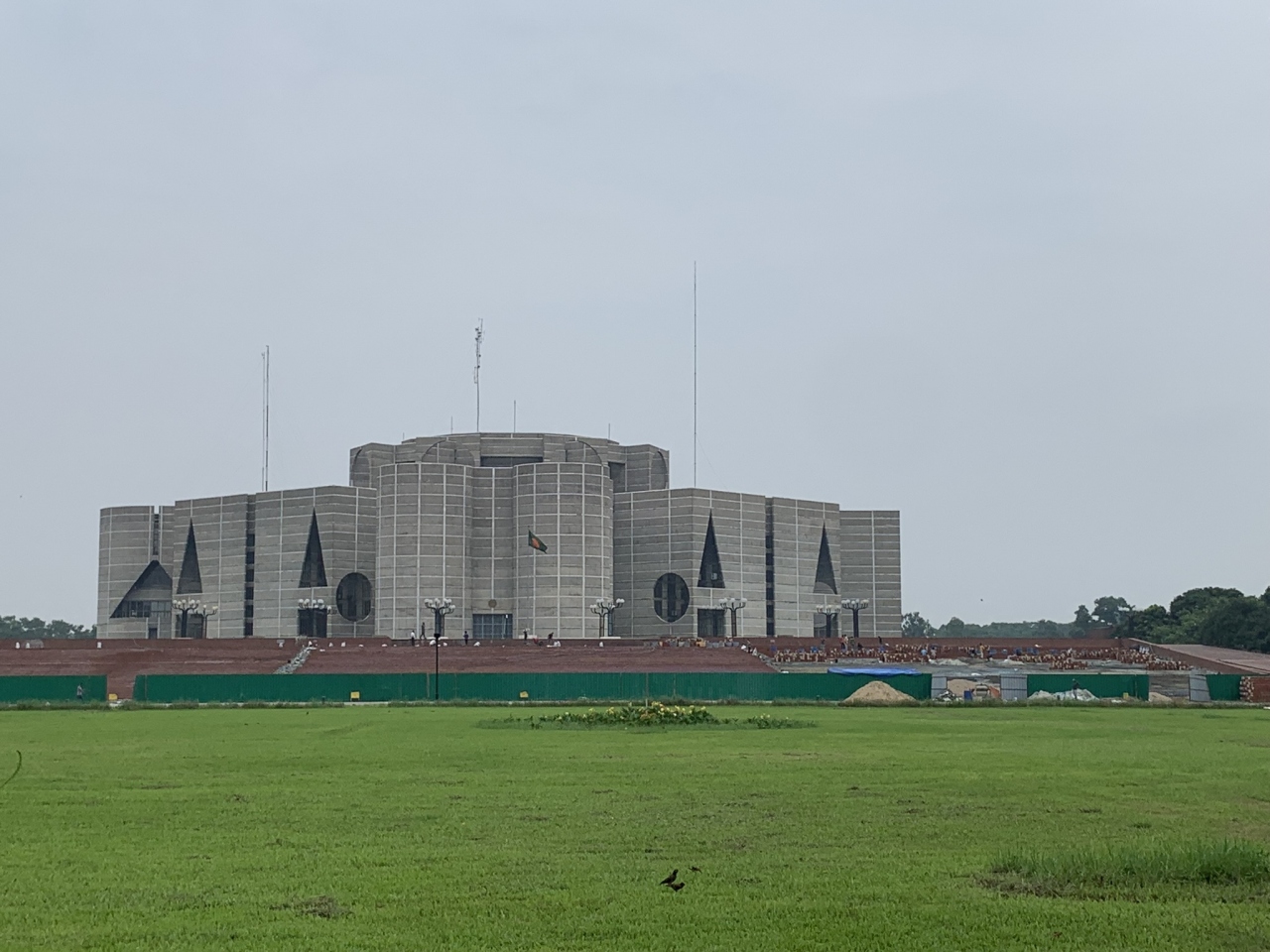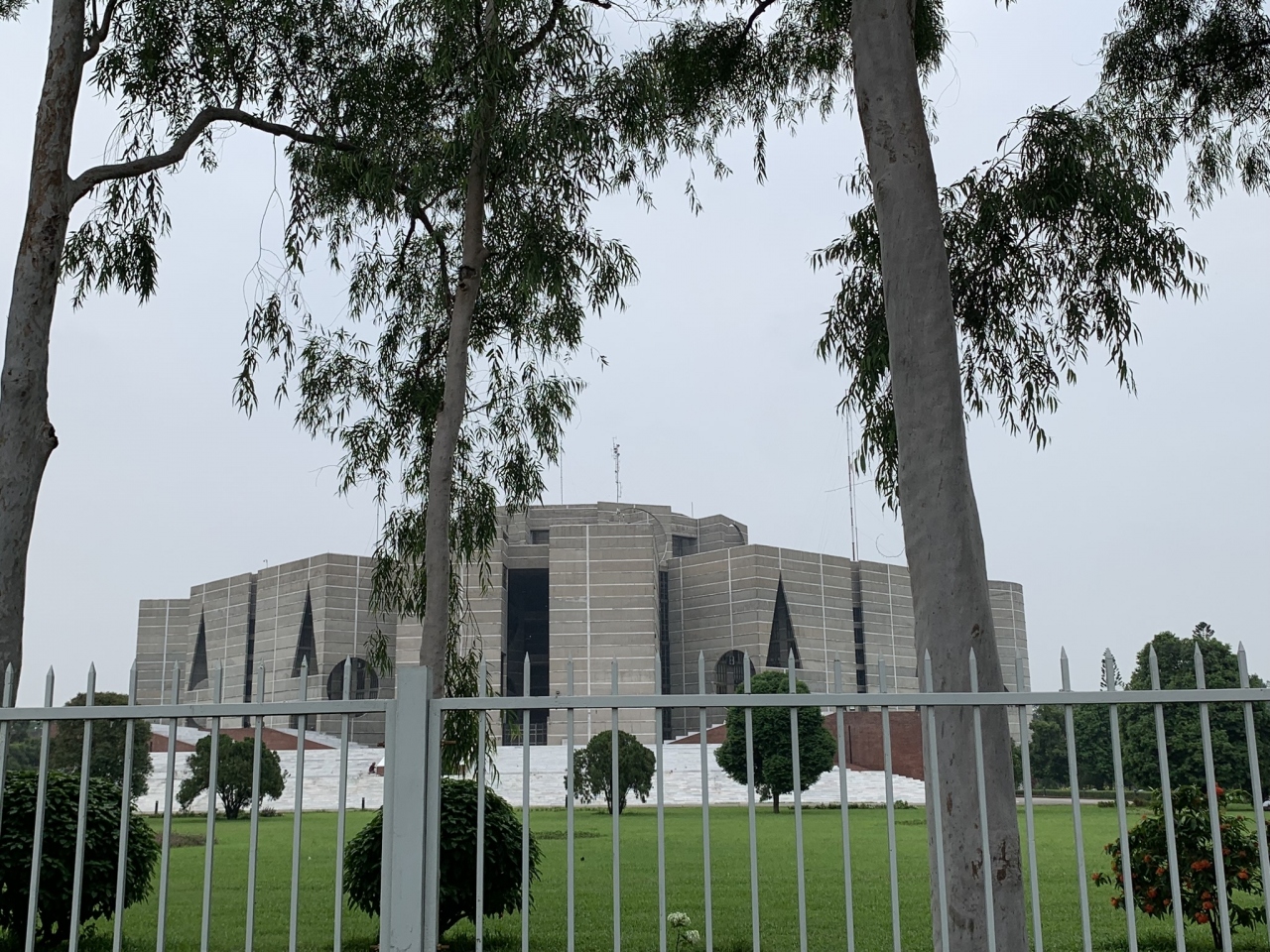 オールドダッカを訪ねたいと頼んだのに、「いいからその前に」とバングラデシュの知人に連れて行かれたのが国会議事堂。彼に限らず、幾人ものバングラデシュ人から「見に行くべき」と全力リコメンドされました。国会の会期中でなければ有料で内部も見学できるとか。ダッカの街では唯一無二の未来的な打ちっぱなしの建物は確かに印象的。但し、広大な芝生を挟んで遥か離れた柵越しの見学になります。