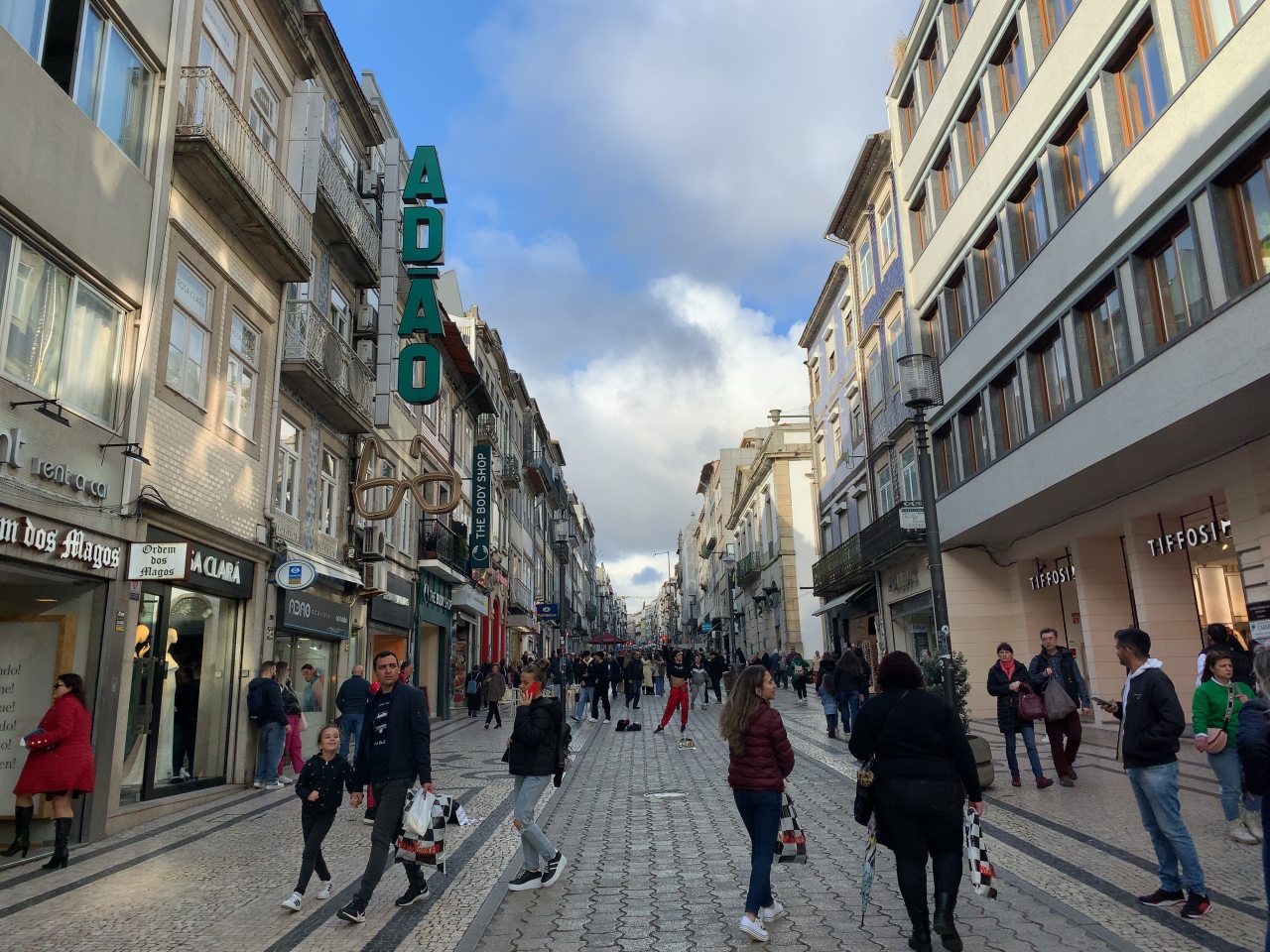 ポルトで一番のショッピングストリートは朝から晩まで大賑わいです。幅はさほど広くない目抜き通りを、地元の人も観光客もひっきりなしに行き交うものの、さして治安の悪さは感じません。銀座風でありながら両脇の店には手の届く値段のファッションブランドも多く見受けられ、疲れたらカフェも点在しているので休憩可。