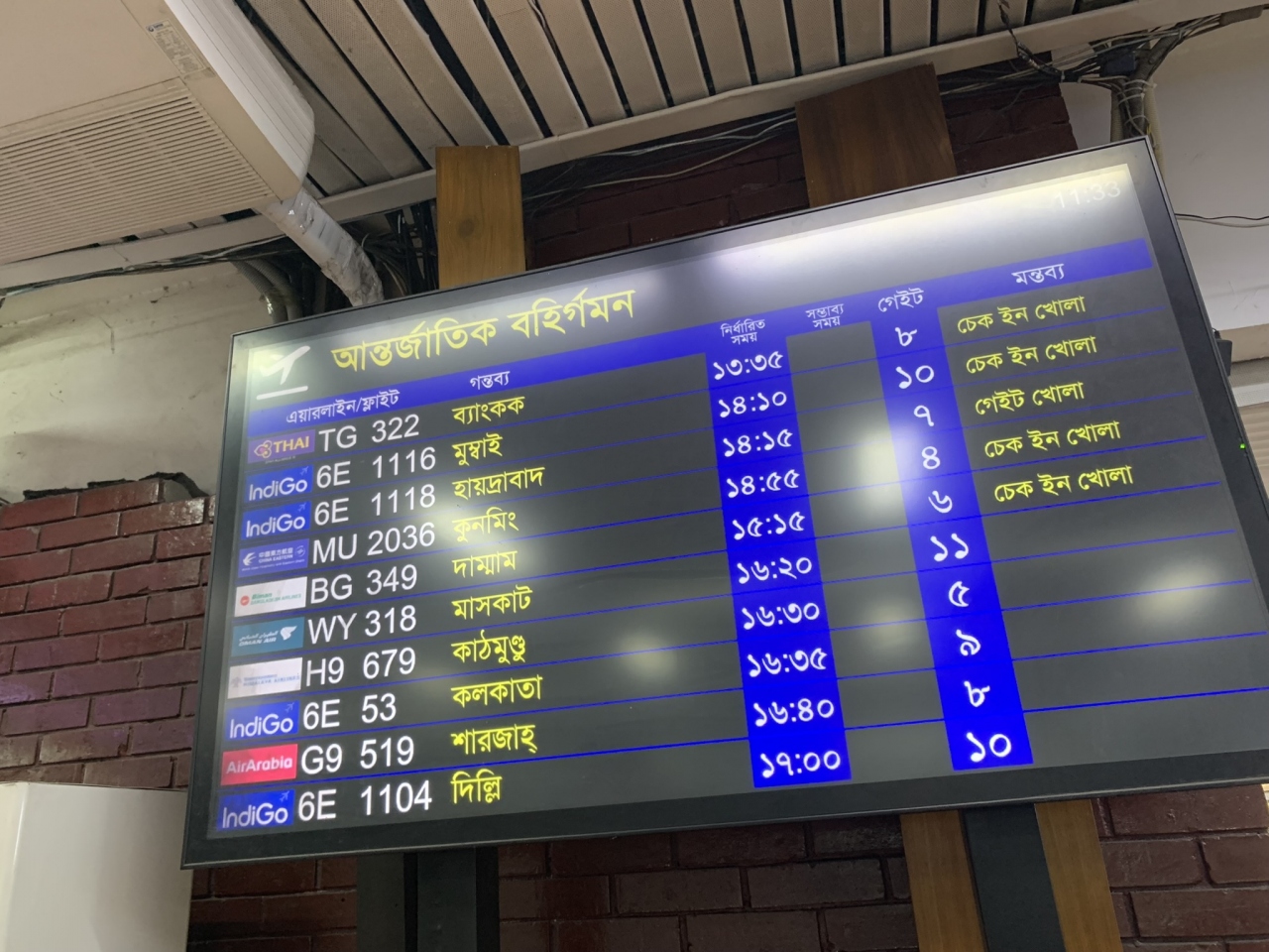年季の入った空港ですが、現在すぐ近くに新空港ビルを建設中です。国内線と国際線は繋がっていました。それなりにフライトもある国際線ターミナルも案内板や離着陸の掲示板も多くがベンガル語表記のみで、特に出国時は自分の便がどのゲートから何時に出るのか解読できず焦りました(因みに航空券は英語表記)。到着時のアライバルビザはイミグレの手前の一角に。日本人は無料で査証がおります。観光の場合は、復路の航空券情報とバングラデシュ国内のホテルの予約証明書を印刷しておくとスムーズです(渡すと返却されません。予めメールで送る事もできるようでしたが)。