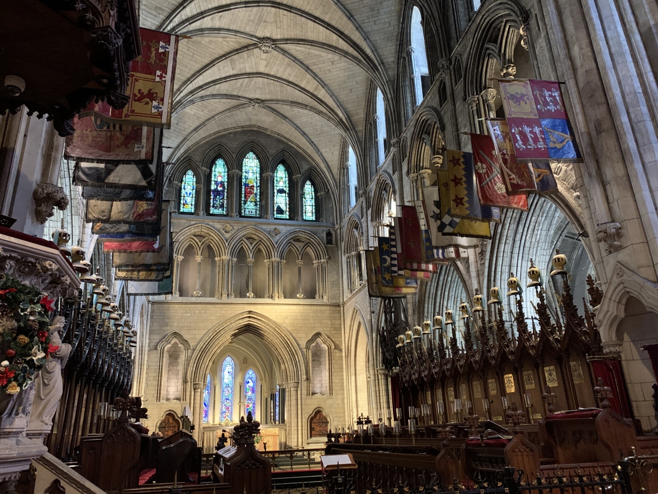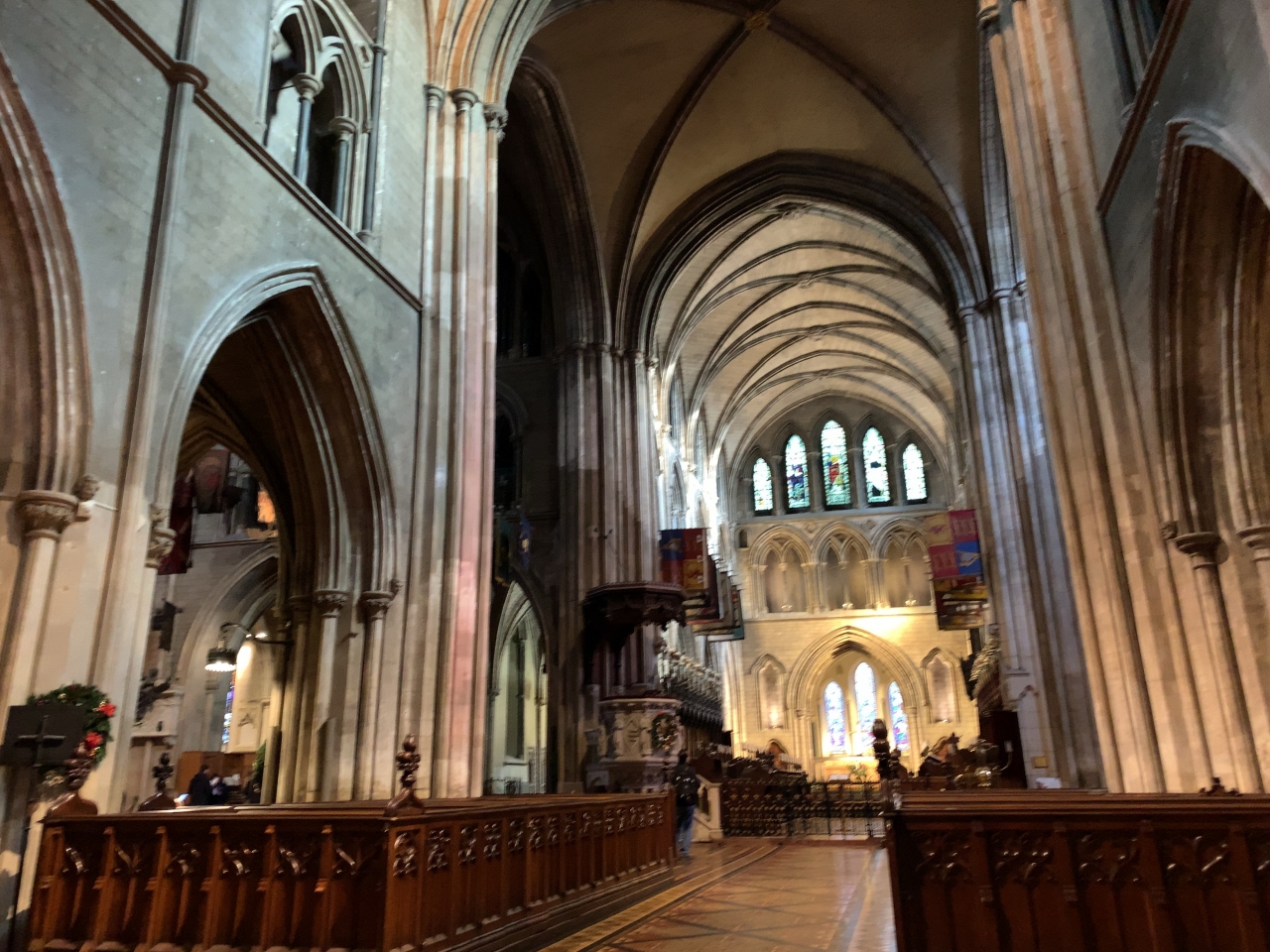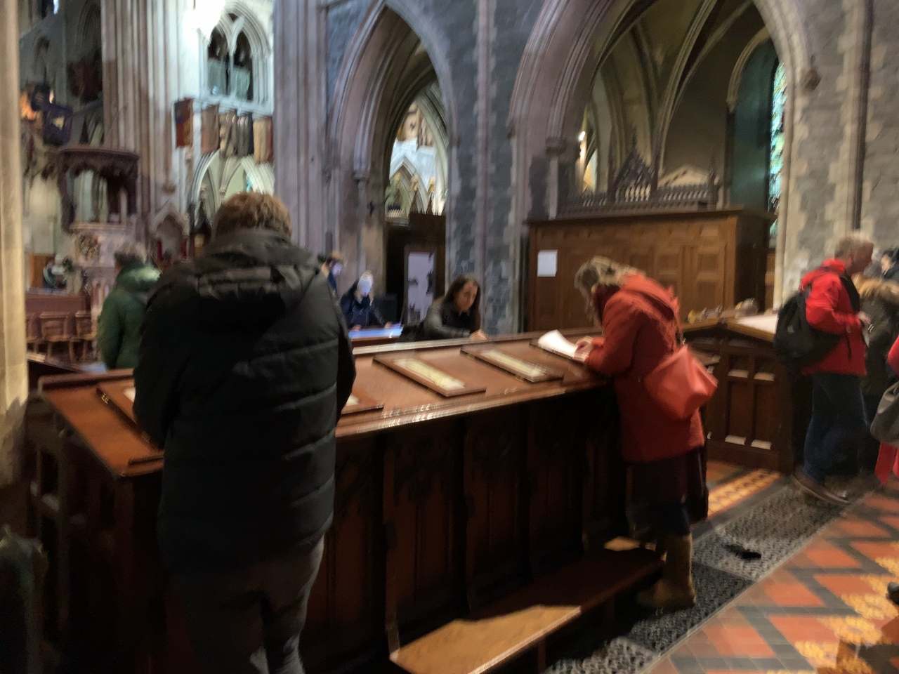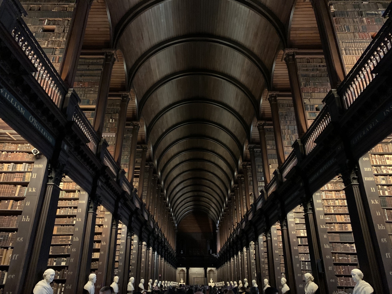 年始の午前中に訪ねましたが、それでも学内には入場待ちの長蛇の列が出来ていました。ネットでチケットを買っていたので、所定の時間になればすんなり入れたものの、お目当ての「世界一美しい図書館」も立錐の余地なし。ただ、カメラを少々パンナップすれば(ちょうど両脇の胸像が入る程度の高さ)良い具合に撮影できました。歴史ある図書館は息を呑む美しさと厳かさです。これまた「世界一美しい」とされるケルズの書は、今年春まで保護作業中とかで、館内にはレプリカのみ(しかしコロナの影響を受けて、春時点でも休館措置がとられています)。