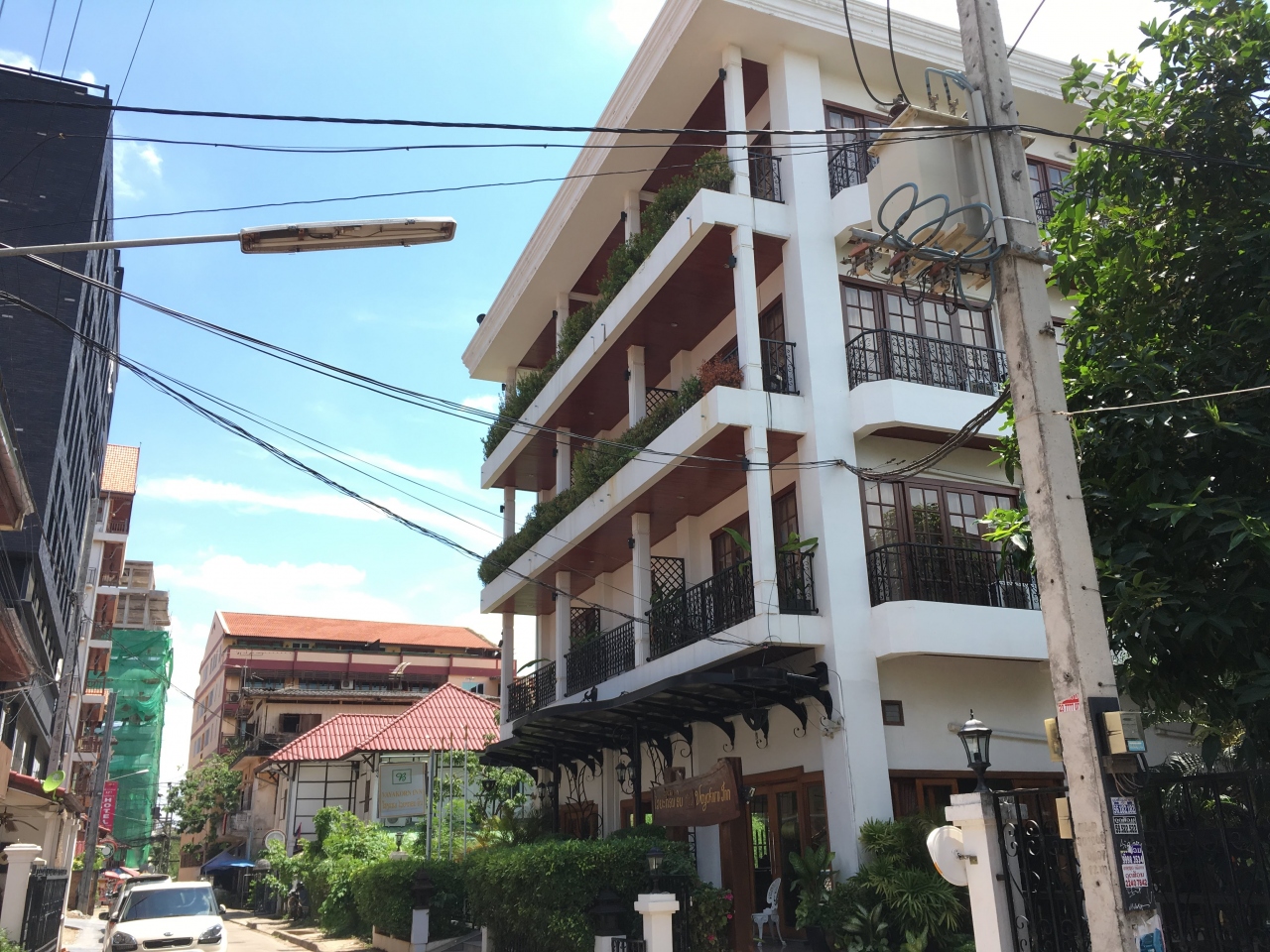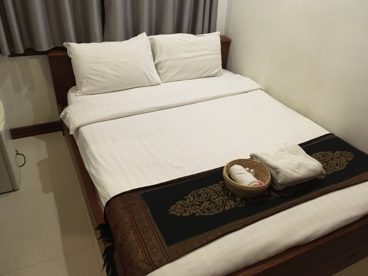 元々コンパクトなビエンチャン中心街ですが、その真ん中というロケーション。メコンまでも徒歩圏で、ホテルの周辺にも飲食店やマッサージ店がたくさん軒を連ねます。繁華街であっても宿泊費はどこも比較的リーズナブルなビエンチャン。基本は朝食込みですが、どかっと卵焼きにハムやソーセージが添えられた極々シンプルなセットです。Wi-Fiは上の階でも好調でした。