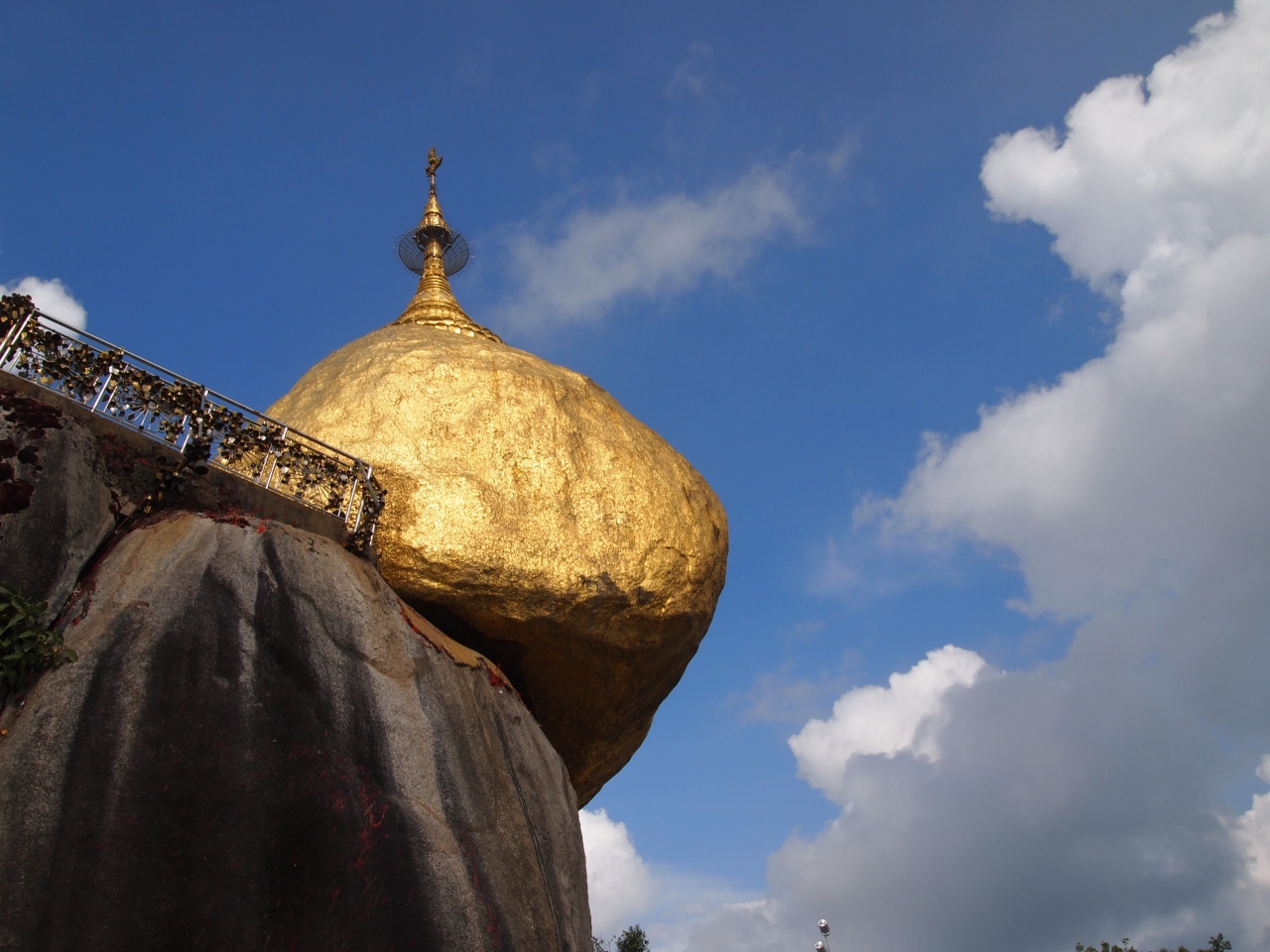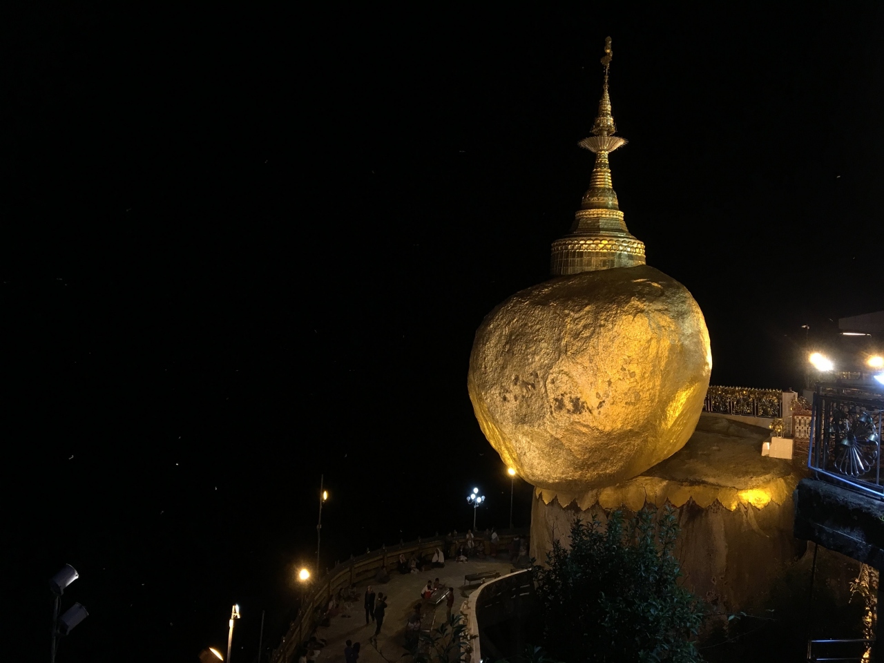 ヤンゴンからはバスで日帰りも可能とは言えども、もし時間が許すなら山頂で一泊して、夕焼けに染まるゴールデンロック、ライトアップされ漆黒の夜を背に浮かび上がるゴールデンロック、朝日に神々しく輝くゴールデンロック、刻々と移ろうその姿をゆったり見つめたいところ。大勢のミャンマー人が境内に泊まって、黄金の岩と寄り添うように過ごす姿を見ると、いかに信仰を集める存在かも実感できます。
