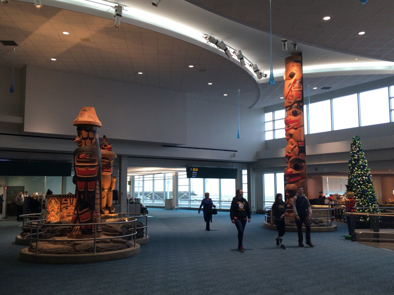 空港内は大小さまざまなトーテムポールを始めユニークな彫像の類があちこちで旅人を迎えてくれます。公共交通機関スカイトレインでダウンタウンを始め、都心の主だった場所へのアクセスも至便。コンパクトな空港内には案内板も十分配置され、初訪問でも安心でした。